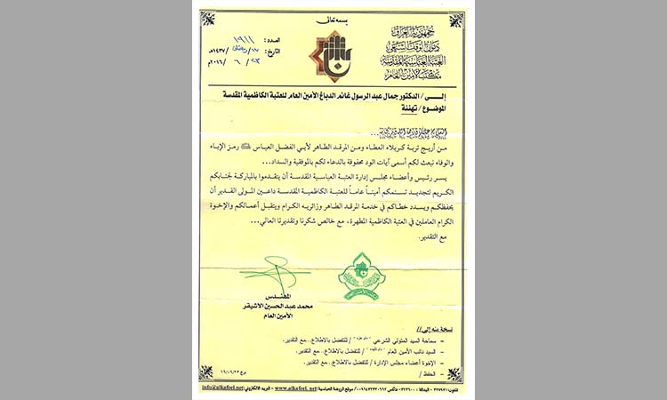 تقدم الأمين العام للعتبة العباسية المقدسة المهندس محمد عبد الحسين الاشيقر وأعضاء مجلس الإدارة بالتهاني والتبريكات إلى أ.د. جمال عبد الرسول الدباغ بمناسبة التجديد لتسنمه التكليف الشرعي لمنصب الأمين العام للعتبة الكاظمية المقدسة، داعين المولى القدير أن يحفظكم ويسدد خطاكم في خدمة مرقد الإمامين الجوادين "عليهما السلام" وزائريه الكرام.