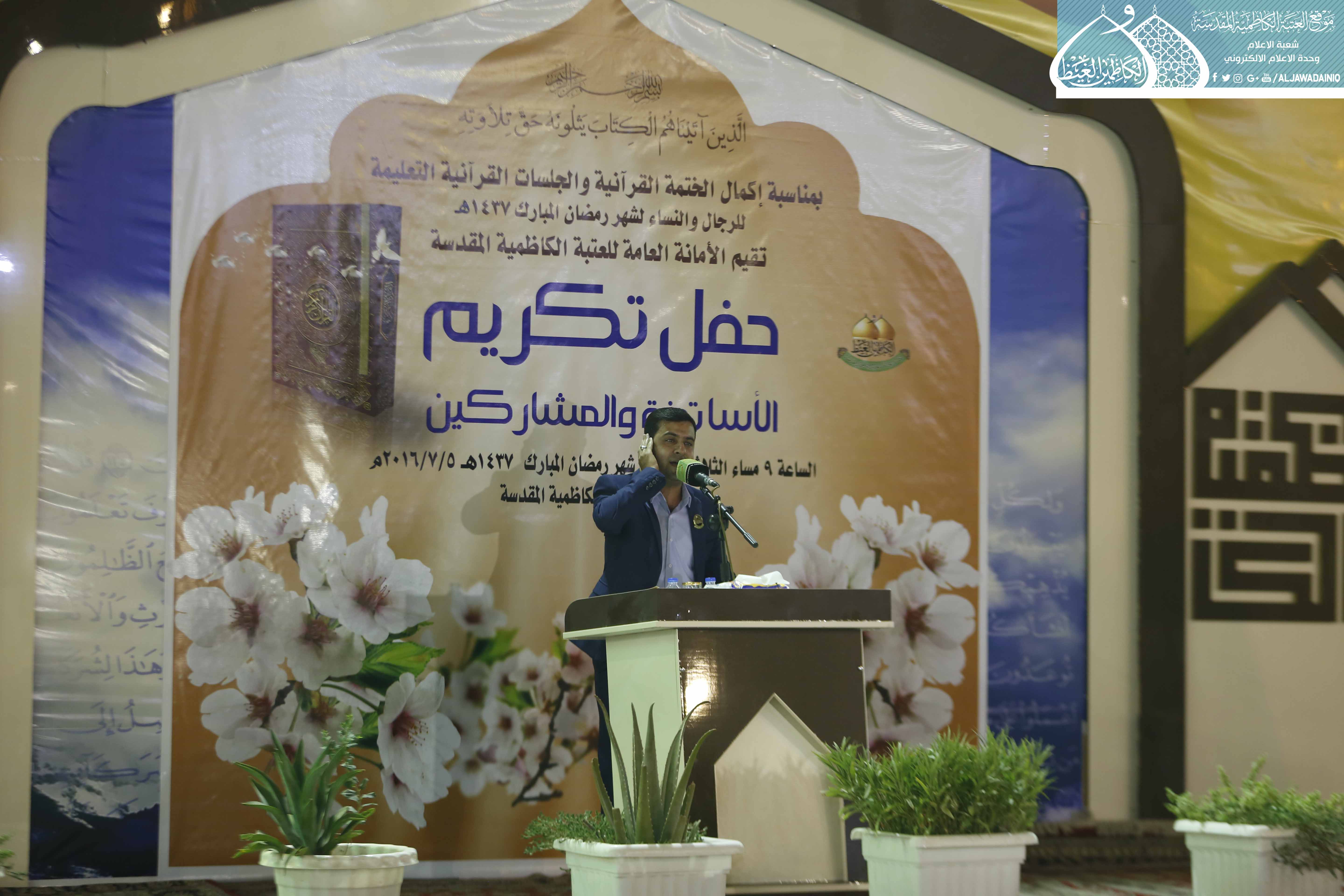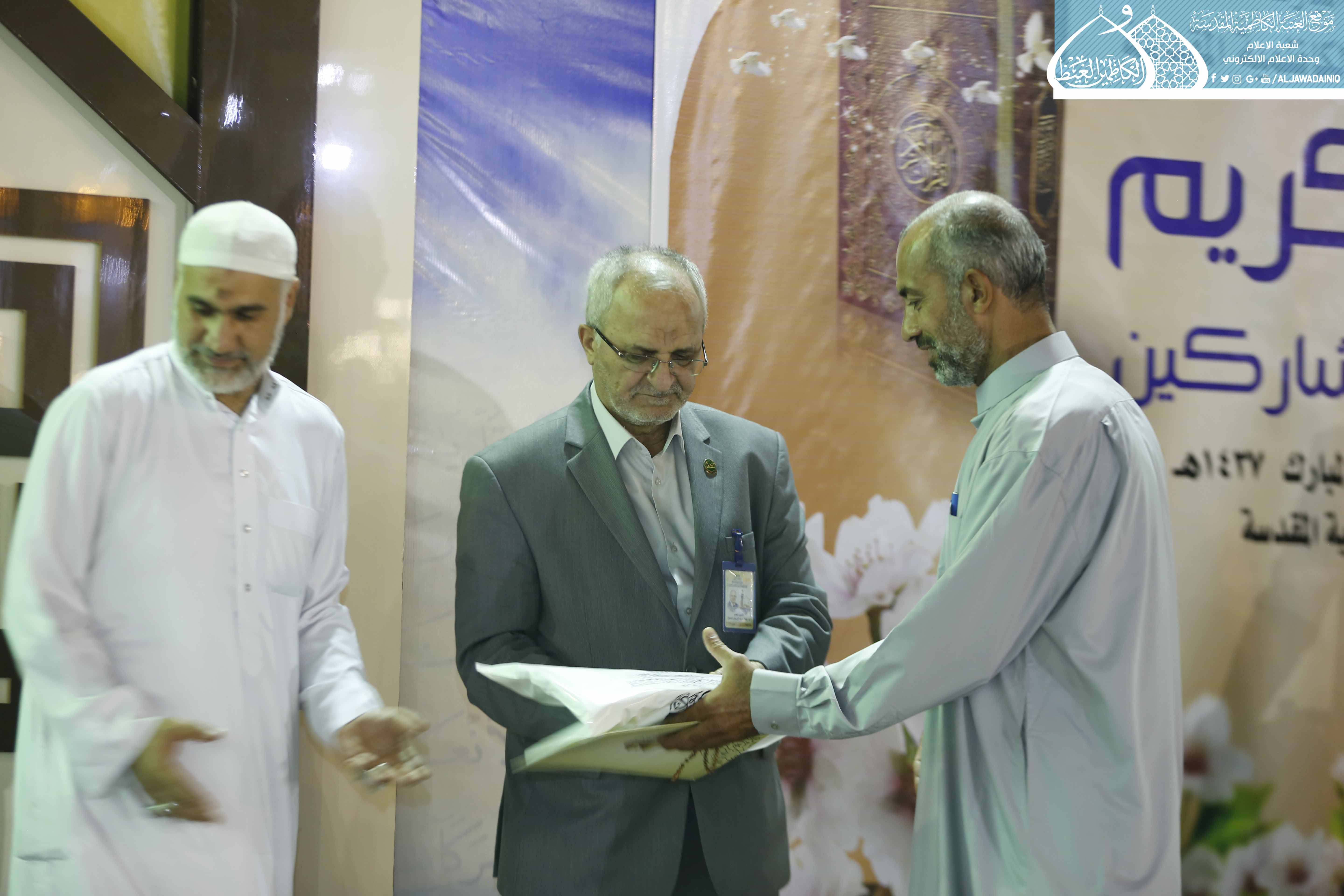 كما نستثمر هذه الفرصة وأدعو أولياء الأمور إلى تشجيع أولادهم في الدورات الصيفية ودورات حفظ القرآن التي تقيمها العتبة المقدسة، لما لهذه الدورات من امكانية اكتشاف المواهب في الأداء والقراءة والحفظ لاحتضانها بعد ذلك في دورات وفق أسلوب أكاديمي، ختاماً نهدي جهودنا وما تلوناه من كتاب الله العزيز خلال الشهر المبارك هدية واصلة ورحمة نازلة إلى أرواح شهداء قواتنا الأمنية وحشدنا الشعبي وكذلك الشهداء من المدنيين الذين قضوا جرّاء العمليات الإرهابية لا سيما في منطقة الكرادة، واختتمت تلك الفعاليات بتوزيع الهدايا على أساتذة الدورات القرآنية والمشاركين من فيض بركات الإمامين الكاظمين "عليهما السلام".