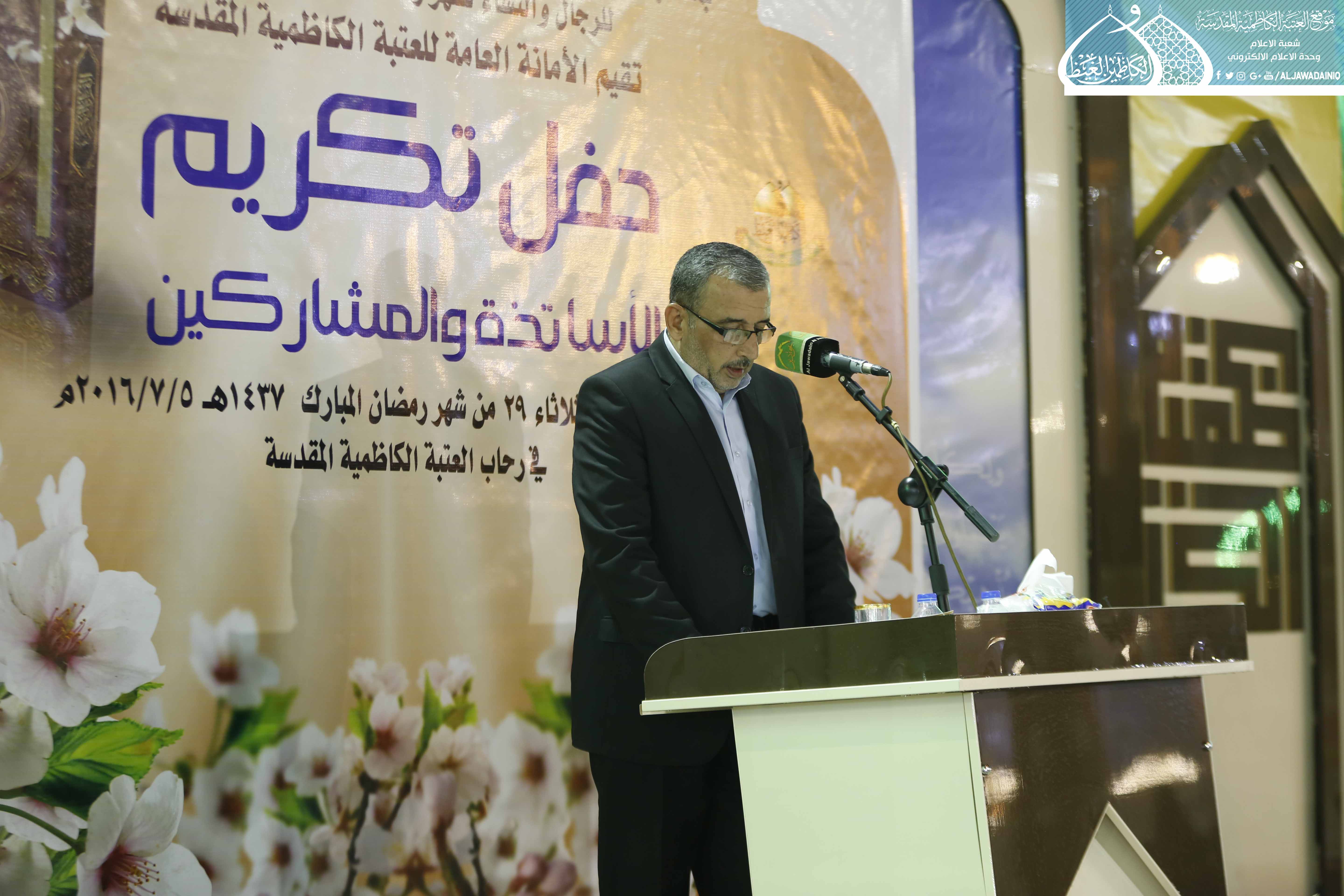 اختتمت العتبة الكاظمية المقدسة برامجها وانشطتها القرآنية والثقافية المتعددة التي شهدتها رحاب الصحن الكاظمي الشريف لإحياء ليالي شهر رمضان المبارك، وهي تحتفي بمشاركة جموع المؤمنين والمؤمنات من زائري الإمامين الجوادين "عليهما السلام"، الذين ارتادوا على هذه المجالس طيلة أيام الشهر الفضيل، بحفل تكريم أقامه دار القرآن الكريم التابع لقسم الشؤون الفكرية والإعلام بحضور الأمين العام للعتبة الكاظمية المقدسة أ.د. جمال عبد الرسول الدباغ وأعضاء مجلس الإدارة وعدد من الأساتذة والمهتمين بالشأن القرآني والمشاركين بالبرامج القرآنية التعليمية من البنين والبنات.
