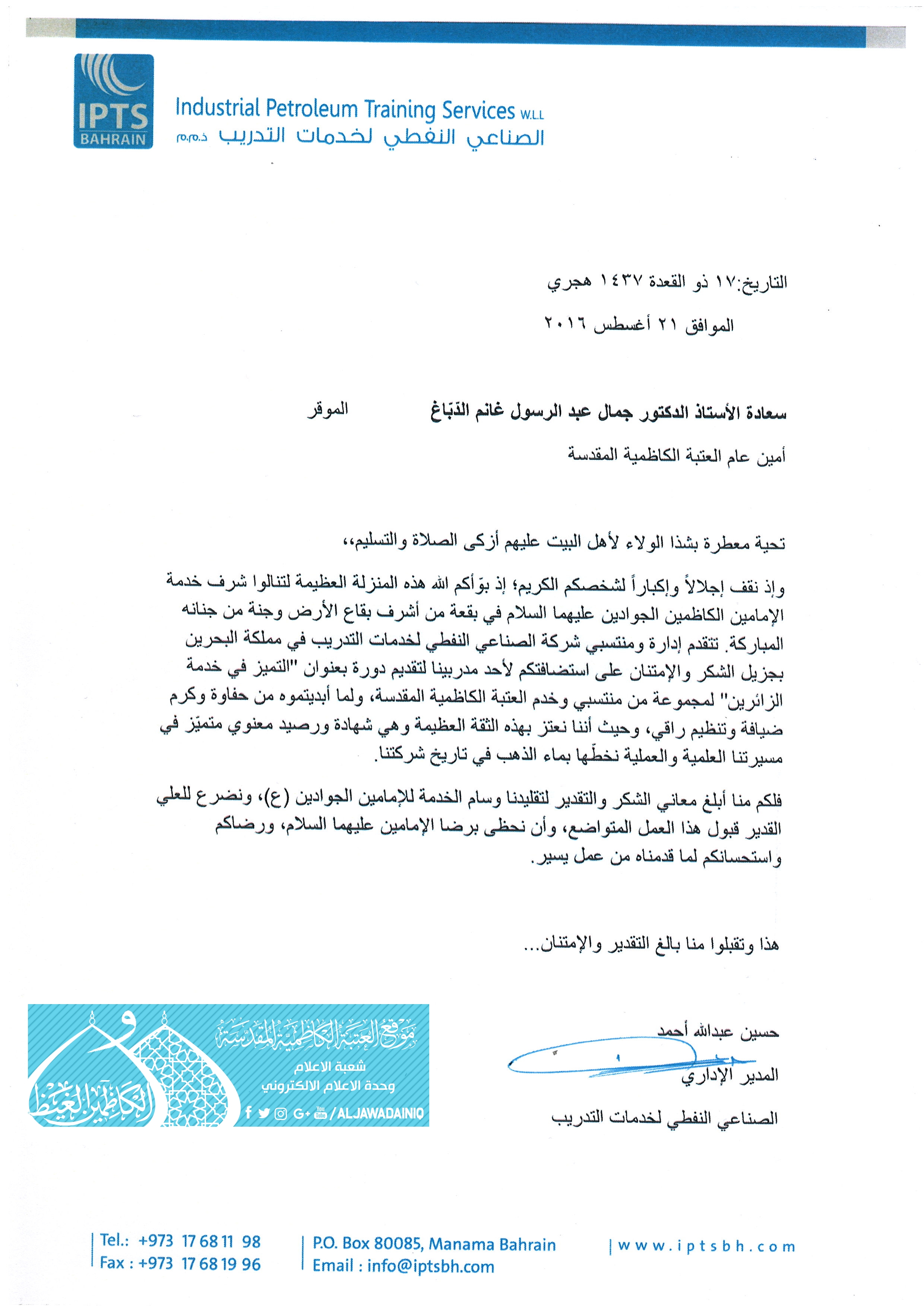 تقدمت إدارة الشركة الصناعي النفطي لخدمات التدريب في مملكة البحرين بالشكر والتقدير إلى الأمين العام للعتبة الكاظمية المقدسة أ.د. جمال عبد الرسول الدباغ، وذلك لاستضافة أحد مُدَربي الشركة وتشرفه بإقامة دورة لكوكبة من خدام العتبة الكاظمية المقدسة بعنوان : "التَميز في خدمة الزائرين"، حيث عدّت شركة الصناعي النفطي هذا التعاون مع الأمانة العامة للعتبة الكاظمية المقدسة بمثابة وسام شرف خدمة الإمامين الجوادين "عليهما السلام" وشهادة تَعتزُ بها ورَصيد مَعنوي مُتميز يُضاف إلى مسيرتها العلمية والعملية.