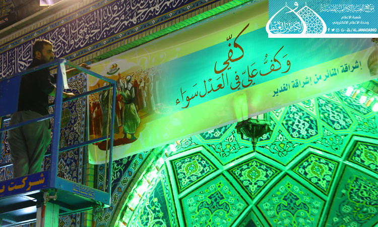 أنهت الملاكات الفنية والخدمية في العتبة الكاظمية المقدسة الأعمال الموكلة إليها، وأعلنت عن استعدادها لإقامة مراسم الحفل المركزي الذي ستشهده رحاب الإمامين الجوادين"عليهما السلام" المزمع إقامته في الثامن عشر من ذي الحجة 1437 الموافق 20 أيلول 2016 بمناسبة عيد الولاية الأعظم .. عيد الغدير الأغر وافتتاح مشروع إعادة تذهيب المنائر بعد إتمام العمل فيها ، حيث عمت أرجاء الصحن الكاظمي الشريف بالفرح والبهجة والسرور ابتهاجاً بهذه المناسبة العطرة ، وتزيين أعمدة وطارمات وأواوين الصحن الشريف استعداداً لاستقبال هذه المناسبة وتقديم أفضل الخدمات للزائرين الكرام.