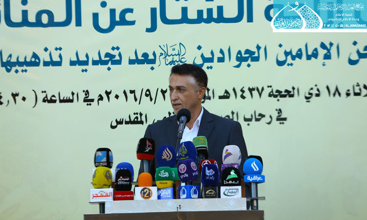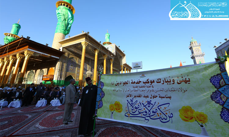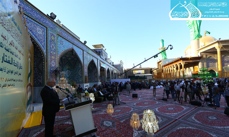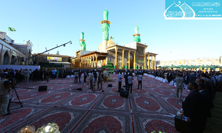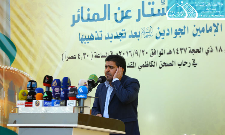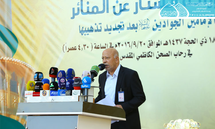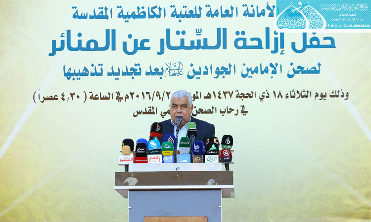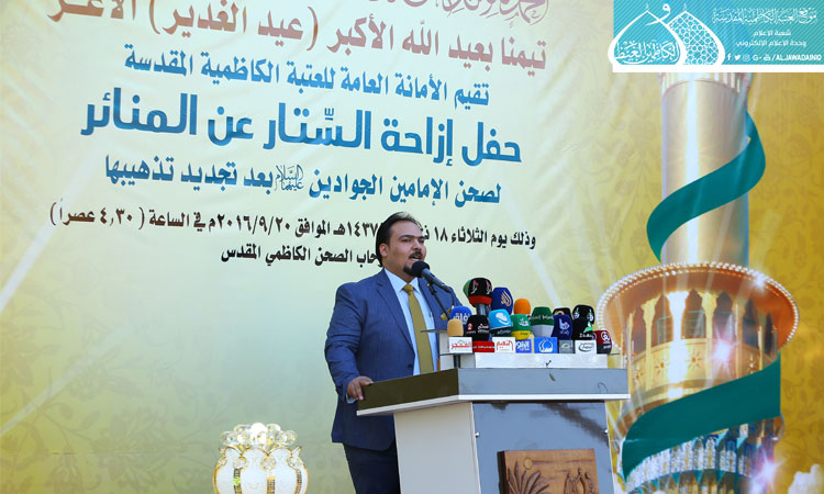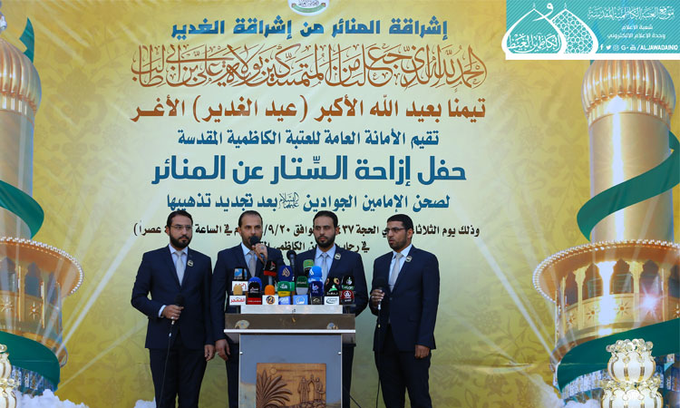 تزامناً مع ذكرى ذلك اليوم المشهود في غدير خم الذي سطع فيه نور الإمامة، وأصبح عنواناً بارزاً لكل القيم والمعاني السامية النبيلة، وحمل بين جوانحه مسؤولية الرسالة المحمدية, وتيمناً بعيد الله الأكبر، يوم التتويج الإلهي لوصي رسول الله "صلى الله عليه وآله" الإمام علي بن أبي طالب "عليه السلام" أميراً للمؤمنين، شهدت العتبة الكاظمية المقدسة عصر الثلاثاء 18 ذي الحجة 1437هـ الموافق 20 أيلول 2016 حفل افتتاح المنائر المباركة للإمامين الجوادين "عليهما السلام" بعد تذهيبها تحت شعار: (إشراقة المنائر من إشراقة الغدير) حيث حرصت تلك الإيادي البيضاء وأخلصت النية لله تعالى وأدركت أن الكمالات المتعالية، لا يمكن إدراكها إلّا بالهمم العالية والنفوس الوثابة لكل ما هو عظيم وصعب مستصعب. وكانت أبجدية حفل افتتاح المنائر في غاية التنسيق والكمال ليغدو يومها يوماً ملهماً فياضاً بالقيم والمُثل كلوحة فنان تمازجت ألوانها تمازجاً عبقرياً يحكي ويعكس تضافر أيدٍ مبدعةٍ، بحضور رئيس ديوان الوقف الشيعي سماحة السيد علاء الموسوي والأمين العام للعتبة الكاظمية المقدسة أ.د. جمال عبد الرسول الدباغ وأمناء العتبات المقدسة العلوية والحسينية والعباسية وأعضاء مجلس الإدارة ومدير مؤسسة الكوثر لإعمار العتبات المقدسة والمزارات الشريفة ونخبة من فضلاء الحوزة العلمية الشريفة وعدد من الشخصيات الحكومية والنيابية وممثلي الدوائر المؤسسات المجتمع المدني وجمع غفير من زائري الإمامين الجوادين "عليهما السلام". واستهل الحفل بتلاوة آيات من الذكر الحكيم، بعدها قراءة إنشودة الفردوس ثم تلتها قراءة سورة الفاتحة المباركة ترحماً على أرواح شهدائنا الأبرار، وشهد الحفل مشاركة لموكب خدام الجوادين وإلقاء كلمات عدّة بهذه المناسبة العظيمة، منها كلمة العتبة الكاظمية المقدسة التي ألقاها أمينها العام أ.د. جمال عبد الرسول الدباغ. وفي رياض الشعر كان للحفل وقفة مع الشعر والشعراء، حيث ألقيت أبيات لتأريخ هذا الحدث للشاعر رياض عبد الغني الكاظمي ومنها هذه الأبيات: وذا صرحُ نجليهِ أتتهُ وفودُنا إلى ركنِهِ تسعى على كلّ ضامرِ تبلّج من بِِشْرٍ فأرّختُهُ زها بِعيدِ عليٍّ وافتتاحِ المـــــــــنائِرِِ بعدها ألقى الشاعر الدكتور جابر الجابري قصيدة بعنوان: (أمير بيوت الوحي) ثم ألقى الشاعر الأديب مهدي جناح الكاظمي قصيدة بعنوان: (الغدير) ثم كانت هناك مشاركة للمنشد كريم الموسوي من الأهواز بمجموعة من الموشحات التي ترنمت بحب أمير المؤمنين "عليه السلام" واختتم الحفل بإزاحة الوشاح الأخضر عن منائِر الجود والكرم.