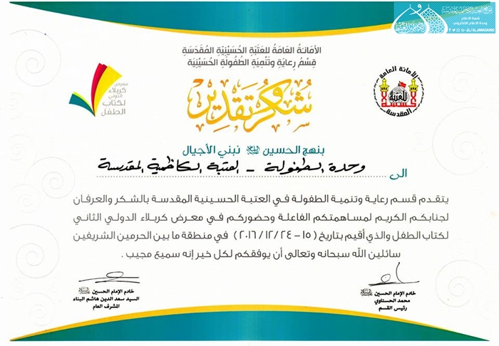 توجهت الأمانة العامة للعتبة الحسينية المقدسة / قسم رعاية وتنمية الطفولة بالشكر والتقدير إلى وحدة الطفولة التابعة لقسم الشؤون الفكرية والإعلام في العتبة الكاظمية المقدسة، وذلك لمشاركتها الفاعلة ومساهمتها الطيبة في معرض كربلاء الدولي الثاني، الذي انطلقت فعالياته في 15ـ 24 ربيع الأول 1438هـ، تحت شعار: (بنهج الحسين "عليه السلام" نبني الأجيال) سائلين المولى القدير أن يوفق الجميع لما يحب ويرضى.