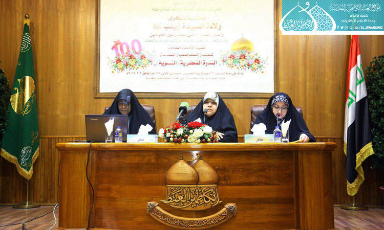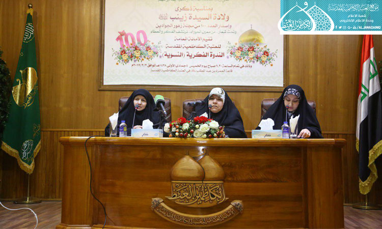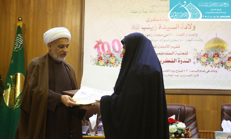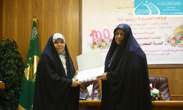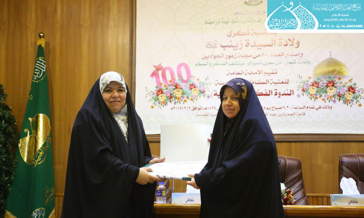 إحياءً لذكرى ولادة عقيلة البيت الهاشميّ السيدة زينب بنت أمير المؤمنين علي بن أبي طالب "عليهما السلام"، وبمناسبة إصدار العدد مائة من مجلة زهور الجوادين, عقدت الأمانة العامة للعتبة الكاظمية المقدسة / قسم الشؤون الفكرية والإعلام الندوة الفكرية النسوية يوم الخميس 4 جمادى الأولى 1438هـ الموافق 2 شباط 2016م في قاعة أسد الله الحمزة بن عبد المطلب "عليه السلام" تحت شعار: " مِن مَعين الحوراء .. نرتشفُ الفكر والعطاء"، بحضور عدد من أعضاءِ مجلس الإدارة وشخصيات نسوية اجتماعية وأكاديمية، استُهلت الندوة بتلاوة معطرة من الذكر الحكيم، بعدها بدأت الجلسة البحثية وكان أول محورها بعنوان: السيدة زينب "عليها السلام" بين القيادة والإعلام، للباحثة الدكتورة حنان عزيز العبيدي، والثاني دور المرأة في إعلام العتبات المقدسة للباحثة كفاح الحداد، والثالث العتبة الكاظمية المقدسة مركز إشعاع فكري " مجلة زهور الجوادين إنموذجا" للباحثة أ.د. وجدان فريق، كما شهدت الندوة عرض تقرير تلفزيوني مصور عن مجلة زهور الجوادين، وتخللت مداخلات وأسئلة من قبل السيدات الحاضرات اللواتي أسهمن في إغناء أجواء النقاش من حيث الطرح والحوار، واختتمت الندوة بتكريم السيدات المحاضرات والكاتبات اللائي لهن إسهامات فكرية متنوعة في مجلة زهور الجوادين.