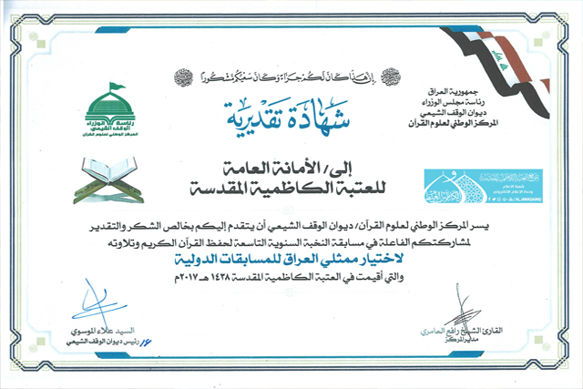 نظراً للدور الرائد الذي تقوم به الأمانة العامة للعتبة الكاظمية المقدسة واهتمامها بكتاب الله تبارك وتعالى والتي وضعت أولى جهودها في ترسيخ المفاهيم والتعاليم القرآنية وإشاعة تلك الثقافة بين طبقات المجتمع الإسلامي وذلك من خلال نشاطاتها ودوراتها محافلها ومسابقاتها ومطبوعاتها القرآنية. منح المركز الوطني لعلوم القرآن شهادة تقديرية إلى الأمانة العامة للعتبة الكاظمية المقدسة لدورها الكبير في استضافتها لمسابقة النخبة السنوية التاسعة لحفظ القرآن الكريم وتلاوته.