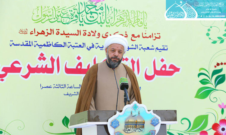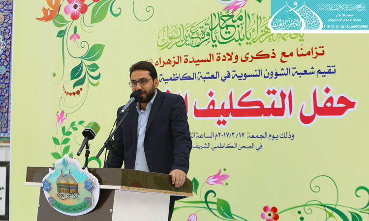 احتفاءً بذكرى ولادة سيدة الطهر والقداسة فاطمة الزهراء "عليها السلام" ، أقامت الأمانة العامة للعتبة الكاظمية المقدسة حفل التكليف الشرعي يوم الجمعة 17 آذار 2017 ، بحضور نائب الأمين العام للعتبة الكاظمية المقدسة سماحة الشيخ عَدِي الكاظمي، وعوائل الفتيات المشاركات والبالغ عددهن (280) مكلفة. افتتح الحفل بتلاوة آيات بينات من كتاب الله العزيز، أعقبها كلمة الأمانة العامة للعتبة الكاظمية المقدسة ألقاها سماحة الشيخ عَدِي الكاظمي هنأ في مطلعها الحضور بهذه المناسبة الميمونة، وبيّن أهمية التكليف الشرعي قائلاً: " أن التكليف الشرعي مسؤولية ملقاة على الإنسان نفسه وعلى ذويه وعلى المجتمع، إذ إننا نقف إزاء مرحلة خطيرة تزخر بالتحديات، فالأعداء يحيطون بنا من كل حدب وصوب مستخدمين كل الوسائل للقضاء على ديننا الحنيف ومعتقداتنا والنَيل من شبابنا وفتياتنا، فلا بد أن نكون في وعي تام ويقظةٍ للتصدي لذلك. ومن أشد الوسائل فتكاً هو الغزو الفكري والحضاري، واليوم تكتسح وسائل الإعلام المتطورة والتواصل الاجتماعي حياتنا وبيوتنا وأسرنا، محاولةً زعزعة ثقافتنا الإسلامية لاستبدالها بالتفسخ والانحلال الخلقي، كما يجب على الأمهات متابعة فتياتهنَّ في كيفية أداء الفرائض اليومية وحثّهنّ على التوجه إلى الله عز وجل بالتزامهنّ بالعبادات والاهتمام بالثقافة الإسلامية المحمدية واتباع ثقافة وتعاليم أهل البيت(عليهم السلام)". وشهد الحفل مشاركة لفرقة إنشاد الجوادين، ومشهداً تمثيلياً بعنوان (حجابي)، ومسابقة الأسئلة، واختتم الحفل بتوزيع مجموعة من الهدايا على المشاركات ممن بلغن سنّ التكليف الشرعي .