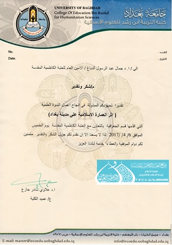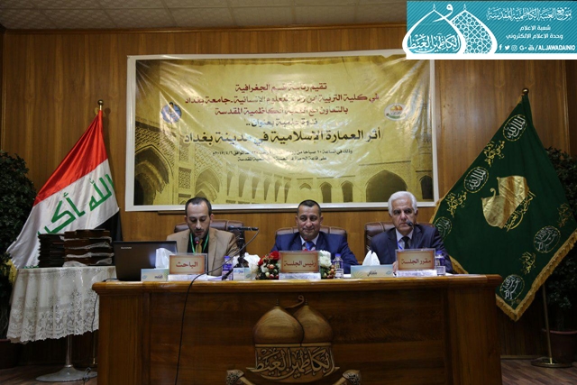 يعتبر التراث المعماري الإسلامي سجلاً لإبداع الأمة، ورمزاً من رموز عبقريتها، وذاكرةً حافظةً لقيمها، ومقوماً من مقومات هويتها الحضارية، ويُعد التراث المعماري علامة مضيئة وثمرة مشعة لهذا الإبداع الذي أسهمت به الحضارة الإسلامية في إغناء الحضارات الإنسانية وإثرائها، إذ أقامت كلية التربية ابن رشد للعلوم الإنسانية/ قسم الجغرافية وبالتعاون مع العتبة الكاظمية المقدسة صباح يوم الخميس 6 نيسان 2017 ندوة العلمية بعنوان: (أثر العمارة الإسلامية على مدينة بغداد)، بحضور الأمين العام للعتبة الكاظمية المقدسة أ . د. جمال عبد الرسول الدباغ وعدد من أعضاء مجلس الإدارة ونخبة من الأساتذة والأكاديميين، استهلت الندوة بتلاوة آيٍ من كتاب الله العزيز، بعدها ألقى الأمين العام للعتبة الكاظمية المقدسة كلمة بهذه المناسبة بيّن خلالها دور الأمانة العامة للعتبة الكاظمية المقدسة وحرصها على احتضان ورعاية العديد من الندوات والمؤتمرات للحفاظ على التراث الإسلامي، وأشار إلى المؤتمر العلمي الدولي السنوي الثامن والمزمع إنعقاده في شهر آب المقبل من هذا العام، كما أكد على أن لا تكون هذه الندوات تقليدية مجرد نجتمع لنستمع بل أن تأخذ طريقها إلى الواقع العملي. بعدها ارتقى المنصة رئيس قسم الجغرافية أ.د. أياد الطائي، وألقى كلمة بهذه المناسبة تقدم فيها بالشكر والتقدير إلى الأمانة العامة للعتبة الكاظمية المقدسة لرعايتها واستضافتها للندوات والمؤتمرات واهتمامها بالتراث الإسلامي . بعدها بدأت أعمال الجلسة العلمية، وألقيت خلالها بحوث عدّة حيث قدّم أ.م.د ضرغام خالد، و أ.م.د محمد جواد عباس بحثاً بعنوان: (تطور العمارة الإسلامية في مزار الصحابي سلمان المحمدي والمزارات الملحقة به)، تلاها بحث بعنوان: (إدارة البيئة وسلامتها في التراث العربي الإسلامي) ألقاه م. د. مالك ناصر، م. د. شاكر مسير وإلقاء، أعقبها بحث بعنوان: (الحضارة وآفاقها في العصر العباسي) ألقته أ.م.د زهرة خضير ثم بحث بعنوان: (لمحات عن السمات المعمارية للفن الإسلامي) ألقته م. د. رغد جمال، و م. د. خمائل شاكر، واختتمت الندوة العلمية بمداخلات وأسئلة السادة الحاضرين أثرتها من حيث الطرح والحوار وتم توزيع شهادات الشكر والتقدير على الباحثين.