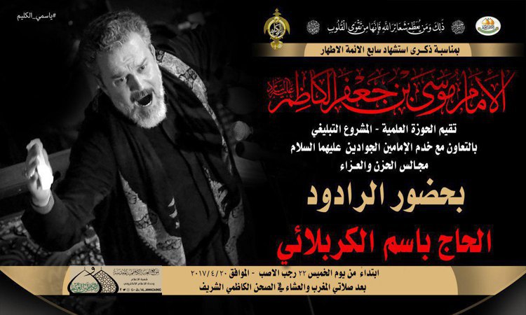 ضمن البرنامج الديني والعزائي للعتبة الكاظمية المقدسة الذي سيبدأ ليلة إعلان مراسم الحدِاد واستبدال رايتي الإمامين الجوادين "عليهما السلام"، الذي يقام تحت شعار: (يا سمي الكليم) تستضيف الأمانة العامة للعتبة الكاظمية المقدسة، الرادود الحسيني الحاج باسم الكربلائي ليحيي بصوته الشجي وقصائده الولائية مجالس العزاء والتأبين التي تشهدها رحاب الصحن الكاظمي الشريف من يوم الخميس 22 رجب الأصب 1438 وذلك إحياءً لذكرى استشهاد وإرث المتقين ابن الهداة الأباة الإمام موسى بن جعفر الكاظم "عليه السلام"، كما يليه الرادود الحسيني عمار الكناني.