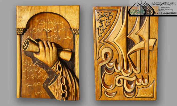 لوحات فنية جديدة لوحدة النقش والزخرفة في العتبة الكاظمية المقدسة، تميزت برؤى وأفكار وزوايا جديدة ذات قيم جمالية، أفصحت عنها تلك الأنامل المبدعة لتوصل رسالتها للعالم أجمع بأن الإمام موسى بن جعفر الكاظم "عليه السلام"، استطاع من تلك الزنزانة أن يضع هارون الجبت والطاغوت خلف قضبان العدالة وأمام محكمة التاريخ ليصبح سجين لعنات الدهر وغضب رب السموات. وللتعرف على أهم إنجازات وحدة النقش والزخرفة بمناسبة ذكرى الاستشهاد الأليمة حدثنا خادم الإمامين الجوادين الأستاذ إبراهيم النقاش قائلاً: الكلّ يعلم مدى حجم الزيارات التي تشهدها العتبة الكاظمية المقدسة وعلى وجه الخصوص ذكرى استشهاد المعذب في قعر السجون وظلم المطامير الإمام موسى بن جعفر الكاظم "عليه السلام" وكيف تُستقبل هذه المناسبة الأليمة من قبل المؤمنين والموالين وهم يستذكرون منزلته ومقامه العظيم "عليه السلام" لدى الباري عز وجل، " لذا من الضروري أن تكون لكل الفنانين والمبدعين بصمات في مثل هكذا مهرجانات دينية تحتضن تلك الحشود المليونية"، فبعد أن قررت الأمانة العامة للعتبة الكاظمية المقدسة أن تطلق برنامجها الديني والثقافي تحت شعار: ( يا سمي الكليم ) ارتأينا أن نخلد شعار هذا العام بلوحة فنية لنساهم من خلالها بنقل الصورة الولائية الخالدة لموالي أئمة أهل البيت "عليهم السلام".