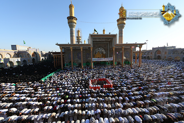 التأمت حشود المؤمنين الوافدين لحرم الإمامين موسى بن جعفر ومحمد بن علي الجواد (ع) في مشهد إيماني كبير احتضنه الصحن الكاظمي الشريف, لأداء مراسم الزيارة لهما في أول أيام العيد السعيد، والمشاركة بشعائر صلاة عيد الفطر المبارك, في هذه الرحاب الطاهرة بإمامة سماحة الشيخ (حيدر النصراوي) وبعد أداء الصلاة ألقى خطبة عبادية ركز في مطلعها بالدعاء بتعجيل فرج مولانا صاحب العصر والزمان الإمام المهدي المنتظر(عج), وقدم التهاني والتبريكات إلى مقام الإمام صاحب العصر والزمان (عج) وإلى مقام المرجعية الرشيدة و العالم الاسلامي كافة. بعدها أكد في خطبته على مبدأ الطاعة والتقوى والخوف من الله و التماس التوبة والعودة إلى حضرته القدسية لان من خلالها يصل الانسان الى مقام ربه ورسوله وأهل البيت(ع).