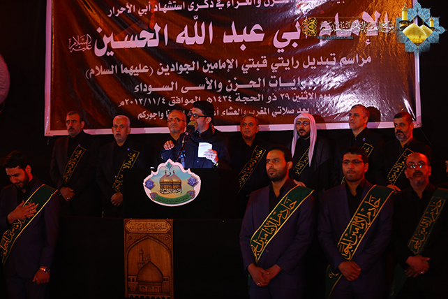 تعتبر ذكرى عاشوراء من الأحداث الكبرى المهمة في التاريخ الإسلامي والتي هزت الضمير الإنساني وغيرت مجرى التاريخ بملحمتها البطولية, لما تحمله في طياتها من قيمٍ ومعانٍ سامية لها وقع كبير في نفوس المسلمين, وبها أضحى الإمام الحسين (عليه السلام) المثل الأعلى للفداء والتضحية ونبراساً للحق، ومناراً للهدى تستضيء به الأُمة الإسلامية, وللإعلان عن بدء موسم الحزن والعزاء في ذكرى استشهاد أبيّ الضيم الإمام الحسين وأهل بيته الأطهار وأصحابه الأخيار (عليهم السلام), أقيمت في رحاب الصحن الكاظمي الشريف في الليلة الأولى من شهر محرم الحرام 1435هـ المراسم السنوية لاستبدال الرايات الخضراء التي تخفق فوق القبتين الشامختين للإمامين الجوادين (عليهما السلام) برايات الحزن السوداء التي تزامنت مع رفعها فوق قباب العتبات المقدسة العلوية والحسينية والعباسية, مواساة للرسول الأكرم(صلى الله عيه وآله) وتجديداً للعهد والولاء للعترة الطاهرة(عليهم السلام) بمصاب سيد شباب أهل الجنة الإمام الحسين(عليه السلام) بحضور الأمين العام للعتبة الكاظمية المقدسة أ.د (جمال الدباغ) وأعضاء مجلس الإدارة, وخَدَمَة الإمامين الجوادين(عليهما السلام) ومشاركة العديد من الشخصيات الدينية والاجتماعية وجمع غفير من أهالي مدينة الكاظمية المقدسة وزائري الإمامين الجوادين(عليهما السلام), استهلت المراسم بتلاوة آيٍ من كتاب الله العزيز شنف بها القارئ(منير عاشور) أسماع الحاضرين, بعدها كلمة الأمانة العامة للعتبة الكاظمية المقدسة ألقاها أمينها العام أ.د (جمال الدباغ) جاء فيها:(نقف اليوم وإياكم وقفة تحدٍ وإصرار على مواصلة الدرب وحثّ الخطى على طريق سيد الشهداء(عليه السلام) واستنكار الجريمة البشعة التي أدمت جبين التاريخ بما ارتكبه الأمويون بحقّ عترة رسول الله(صلى الله عليه وآله) الجريمة التي أبكت ملائكة السماء واهتزَ لها عرش الرحمن جل وعلا.