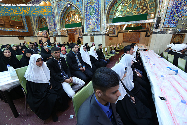 (أيها الإخوة .. بولادته(ص) كشفت الغمة عن هذه الأمة فلنتوحد ونجمع شملنا ويجب ان نحافظ على هويتنا الإسلامية ووحدتنا من خلال اتباع الرسول في منهجه ومسيرته لأنه حجة الله علينا كما جاء في كتاب الله العزيز(وَمَا آتَاكُمُ الرَّسُولُ فَخُذُوهُ وَمَا نَهَاكُمْ عَنْهُ فَانتَهُوا وَاتَّقُوا اللَّهَ), وأن نعيش امة متحابة متعاونة تدعو الى كلمة الله (ادْعُ إِلِى سَبِيلِ رَبِّكَ بِالْحِكْمَةِ وَالْمَوْعِظَةِ الْحَسَنَةِ). وحث العرسان بقوله : ان الحياة فيها صيانة للعرض وعفة النفس والمحافظة على تعاليم الدين والقيم الاجتماعية الأصيلة, إن الزواج والاحتفاء في هذا المكان المقدس ما هو إلا فخر وشرف عظيم أن تبدأ الحياة الزوجية من جوار الإمامين الجوادين(ع) في بناء أسر مسلمة تضع أول أقدامها على الطريق الصحيح وحفاظها على الأخلاق السامية كما شكر سماحته جميع المشاركين والمساهمين والمتبرعين لهذا العمل المبارك سائلاً الله تعالى ان يوفق الجميع لكل عمل صالح فيه طاعة لله ورسوله وأهل البيت(ع).