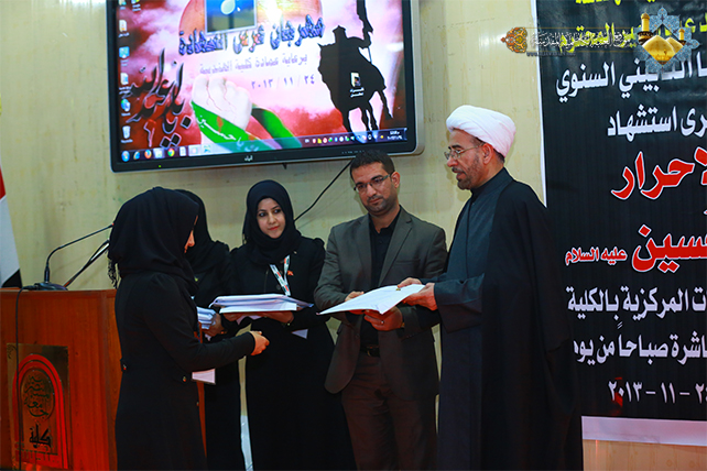 انطلاقاً من اهتمامات العتبة الكاظمية المقدسة بشريحة الشباب من خلال تواصلها بنشاطاتها الثقافية مع الجامعات العراقية ولأجل إحياء فكر وتراث أئمة الهدى (عليهم السلام), شاركت الأمانة العامة للعتبة الكاظمية المقدسة وبتوجيه من أمينها العام أ.د(جمال الدباغ) في الحفل التأبيني السنوي لذكرى استشهاد أبي الأحرار الإمام الحسين وأهل بيته وأصحابه(عليهم السلام), الذي أقامته كلية الهندسة/الجامعة المستنصرية على قاعة الاحتفالات المركزية, برعاية أ.م.د (جمال سعيد عبد الأمير) عميد كلية الهندسة وبحضور العديد من الشخصيات الدينية والاجتماعية والسياسية والأكاديمية وأساتذة الجامعات , واستهل الحفل التأبيني بتلاوة مباركة من الذكر الحكيم شنف بها أسماع الحاضرين قارئ العتبة الكاظمية المقدسة (بلاسم جليل ) تلتها كلمة عضو لجنة التعليم العالي النيابية د.(وليد الحلي) استعرض فيها جزءً من بحثه عن قيم حقوق الإنسان في النهضة الحسينية وارتباطها بمنظومة حقوق الإنسان العالمية المكونة من (العدالة والأخلاق والحقوق والحريات والواجبات) موضحاً فيها كيف جسدت ثورة الإمام الحسين(عليه السلام) القيم الأخلاقية والإنسانية, ووضعت منهجاً للتصدي للطغاة في كل زمان ومكان .