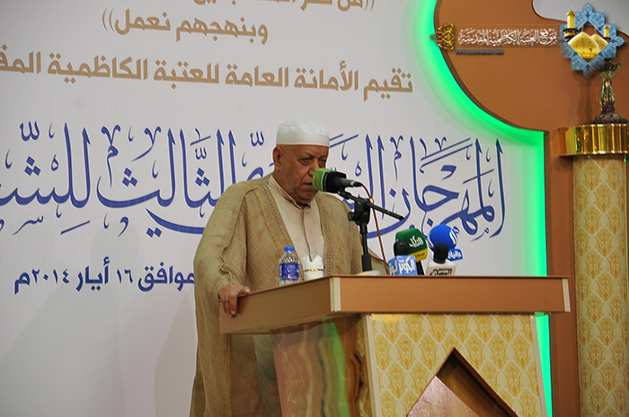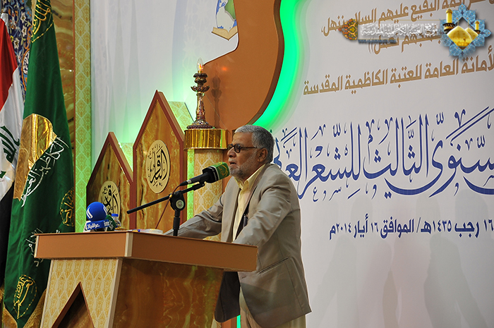 وأضاف قائلاً: لقد حرصت الأمانة العامة للعتبة الكاظمية المقدسة على إقامة المهرجان الشعري ورعايته عاماً بعد عام حرصاً منها على خلق فضاءات ومساحات واسعة للإبداع، تحتضن فيها المواهب والقدرات الأدبية لتنتج مزايا وفنوناً شعرية تعبر عن خصوصية لآل البيت "عليهم السلام" ذات مستوى عالٍ من العطاء والإبداع، وكان دور لجنة تقويم النصوص اختيار ما هو أفضل لأجل أن يكون الاختيار مميزا لهذا العام أملاً منها أن يصبح المهرجان السنوي للشعر العربي في العتبة الكاظمية المقدسة مضماراً يتبارى ويتسابق فيه المبدعون من الشعراء، ونؤكد ذلك أن القصائد المختارة للمشاركة لهذا العام هي (27) قصيدة من بين (58) قصيدة وردت للجنة المنظمة.."