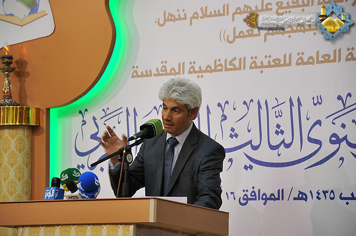 فتحت العتبة الكاظمية المقدسة أبوابها مشرعةً أمام ينابيع الفكر وفضاءات الثقافة والإبداع الأصيل، أمام الشعر والشعراء والكلمة الصادقة، أمام المفردات الجميلة في لغة الضاد، حيث مزجت بين ألوان الثقافة المتنوعة وخلاصة الأفكار، لتنسج من الخيال الواسع والإحساس المرهف أروع الصور الشعرية، وتَرسمُ لوحات وجدانية رائعة تنم عن حب أئمة البقيع (عليهم السلام)، وتسهم بتلك النتاجات المباركة رفد الحركة الأدبية والثقافية وإحياء التراث العربي الأصيل والحفاظ على الهوية الشعرية لتنير بها طريق الأجيال القادمة، إذ انطلقت صباح يوم الجمعة 16رجب الأصب 1435هـ الموافق16/5/2014م، في قاعة مضيف الإمامين الكاظمين (عليهما السلام) وقائع فعاليات المهرجان الشعري السنوي الثالث التي درجت على تنظيمه سنوياً الأمانة العامة للعتبة الكاظمية المقدسة، والمنعقد تحت شعار: " من فكر ائمة البقيع(عليهم السلام) ننهل وبنهجهم نعمل"، وحضر حفل الافتتاح الأمين العام للعتبة الكاظمية المقدسة أ.د "جمال الدباغ" وأعضاء مجلس الإدارة والشخصيات الدينية وخَدَمَة الإمامين الجوادين وكوكبة من الأدباء والكتّاب والمثقفين المتذوقين للشعر العربي الفصيح، وبمشاركة نخبة من الشعراء الذين حضروا من مختلف محافظات عراقنا العزيز، جاءوا ليساهموا برفيف نبضات قلوبهم ويظلوا بظلال قصائدهم الغراء في هذا الملتقى الأدبي. استهل حفل الافتتاح بتلاوة آيات مباركة من القرآن الحكيم شنّف بها القارئ الحاج "محمد حسين الشامي" أسماع الحاضرين بعدها صدحت حناجر فرقة إنشاد الجوادين بقراءة "أنشودة الفردوس"، تلتها كلمة الأمانة العامة للعتبة الكاظمية المقدسة وألقاها أمينها العام أ.د "جمال الدباغ" وبيّن فيها قائلاً: " نجتمع في هذه الرحاب الطاهرة لنحتفي في مهرجاننا السنوي هذا بأئمة كانوا وما زالوا قدوة ومنارا للإنسانية، إذ تركوا لنا إرثا فكريا في جميع مناحي الحياة، وهذه التركة تلقي علينا مسؤولية تأريخية لحمل رسالتهم ونشرها عبر الأجيال، ولعل من وسائل النشر والتوثيق والتثقيف هو فن الشعر العربي، وما نحن بصددهم اليوم هم أئمة أربعة تشرف بضم أجسادهم ثرى البقيع..