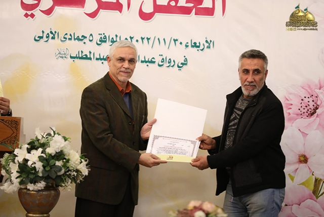 بعدها تألق المُنشد الحُسيني خادم العتبة المقدسة كرار الكاظمي، وثم الرادود القدير مرتضى السندي الكاظمي إذ صدحت حناجرهم وترنّمت بروائع الكلمات والأهازيج الجميلة معبّرين عن الولاء المُطلق لصاحبة الذكرى "عليها السلام" ليرسموا الفرحة والبهجة والسرور في نفوس الحاضرين، واختتم الحفل بتكريم متولي الجوامع والحُسينيات وأصحاب المواكب والهيئات ممن قدموا الخدمة لزائري موسم الأربعين.