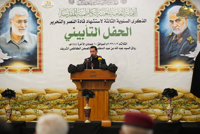 واستهل الحفل بتلاوة آي من الذكر الحكيم، تلتها كلمة الأمانة العامة للعتبة الكاظمية المقدسة ألقاها أمينها العام، حيث استشهد في مقدمتها بالكلمة التي وردت من مكتب سماحة المرجع الديني الأعلى السيد علي الحسيني السيستاني (دام ظله الوارف)، وقرأت في حينها على الملأ بكربلاء المقدسة في خطبة أول جمعة بعد استشهاد قادة النصر ورفاقهم الأبطال، وما تضمنته من كلمات تصوّر عظم الألم الممتزج بالخوف على عراق المقدسات، وفداحة الخطب ووحشية العدو المتربص بشعب هذا البلد الجريح، وأضاف قائلاً:( نقف اليوم في الذكرى الثالثة لاستشهاد المجاهد أبي مهدي المهندس ورفيق دربه الحاج قاسم سليماني وثلة مؤمنة ممن كانوا معهما لنؤبن قامتين من قامات الجهاد في العصر الحديث فالتاريخ كانَ شاهدا على تضحياتِهِم وتضحيات كل الملبين لفتوى الدفاع الكفائي من أجلِنَا، ومن أجلِ مقدساتِنا، (والجودُ بالنفسِ أقصى غايةِ الجودِ)، وأبلغُ كلمات نقدِّمُها إليهِمْ هو الإقرارُ والعرفانُ بأنَّهم أهلُ ذلكَ النصر، فما أعظمَها من كلماتٍ حيثُ عبَّرَتِ المرجعيةُ في بيانِ النصرِ بالقول: (فالنصرُ منكُمْ ولَكُمْ وإليكُمْ وأنتُمْ أهلُهُ وأصحابُهُ فهنيئًا لكم به وهنيئًا لشعبِكُم بكم وبوركتُمْ وبورِكَت تلكَ السواعِدُ الكريمةُ التي قاتلتم بها، وبوركَتْ تلكَ الحجورُ الطاهرَةُ التي رُبِّيتُمْ فيها، أنتُمْ فخرُنا وعِزُّنا ومَنْ نباهي بهِ سائِرَ الأمم).
