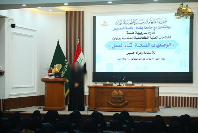 بغية الارتقاء بمستوى الوعي الصحي والثقافي لدى خادمات العتبة المقدسة، وتهيئة الأجواء الصحية الملائمة لهن، نظمت الأمانة العامة للعتبة الكاظمية المقدسة، وحدة التدريب والتأهيل، وبالتعاون مع جامعة بغداد/ كلية التمريض ندوة تدريبية طبية توعوية بعنوان: (الوضعيات الصحية أثناء العمل) إذ قدّمت خلالها الأستاذة زهراء حسين سلسلة من الإرشادات والنصائح الخاصة بالطرق السليمة للجلوس، وكيفية أداء التمارين الرياضية الصحيحة التي تحافظ على استقامة البدن وتمنع التحدب وغيرها من المشاكل التي تصيب المفاصل والعمود الفقري.