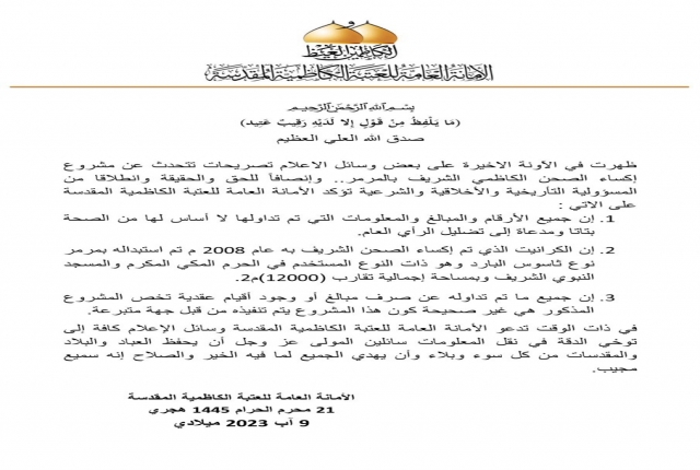 ظهرت في الآونة الأخيرة على بعض وسائل الاعلام تصريحات تتحدث عن مشروع إكساء الصحن الكاظمي الشريف بالمرمر ... وإنصافاً للحق والحقيقة وانطلاقا من المسؤولية التاريخية والأخلاقية والشرعية تؤكد الأمانة العامة للعتبة الكاظمية المقدسة على الاتي: