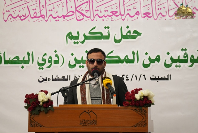 ومن هذا المكان المقدس، مرقد الإمامين الجوادين "عليهما السلام" نشكر كل من ساهمت يده في تأسيس وإنجاح هذا الحفل المبارك، كما ندعو جميع المؤسسات إلى الاهتمام بشريحة المكفوفين، وتأمين الحياة الكريمة لهم).