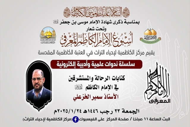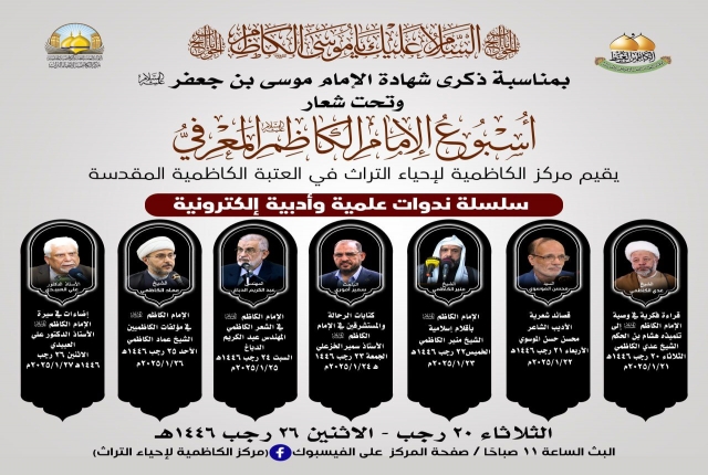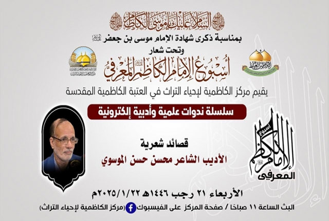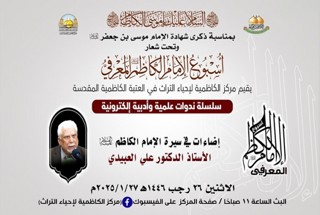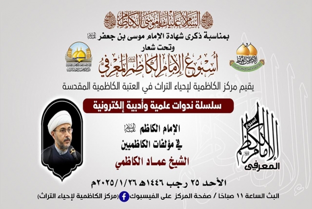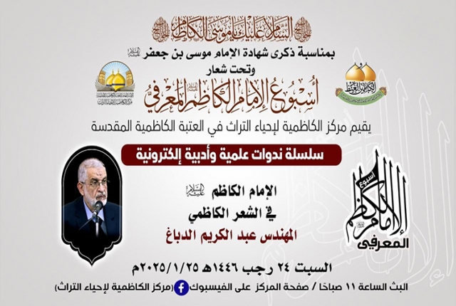 في رحاب الذكرى الأليمة، إذ تترددت عبارات الحزن في أروقة الزمن، لتحيي ذكرى استشهاد سجين بغداد موسى بن جعفر الكاظم "عليه السلام"، ذلك الإمام الذي أضاء دروب الإنسانية بمعارفه وسيرته الطاهرة، حين عاش مظلوماً محبوساً في ظلمات السجون، لكنه كان كالشمس التي تنير ولو خلف القضبان، ينثر الحكم، ويزرع بذور العلم والإيمان في أرجاء القلوب والعقول، وفي هذه الأيام التي تتشح بالسواد إجلالاً لذكراه، وبتوجيه من قبل خادم الإمامين الكاظمين الجوادين "عليهما السلام" الأمين العام للعتبة الكاظمية المقدسة الدكتور حيدر حسن الشمّري، انطلقت فعاليات أسبوع الإمام الكاظم "عليه السلام" المعرفي الأول، الذي أقامه مركز الكاظمية لإحياء التراث في العتبة الكاظمية المقدسة، بمشاركة نخبة الأساتذة والباحثين كل من: (الأستاذ الدكتور علي العبيدي، وفضيلة الشيخ عَدِي الكاظمي، وفضيلة الشيخ عماد الكاظمي، والمهندس عبد الكريم الدباغ، والشاعر محسن الموسوي، وفضيلة الشيخ منير الكاظمي، والباحث سمير موري)، والذي سيقدّم سلسلة من الندوات العلمية والأدبية عبر المنصات الإلكترونية، لتكون محطةً للتأمل في إمامنا الكاظم، وفرصة لإحياء معالم فكره النير، واستقاء الحكمة من فصول حياته الشريفة المليئة بالصبر والثبات على الحق حين اختزلت معاني التضحية والوفاء لله تعالى ولنبينا الأكرم "صلى الله عليه وآله وسلم" ورسالته السماوية.