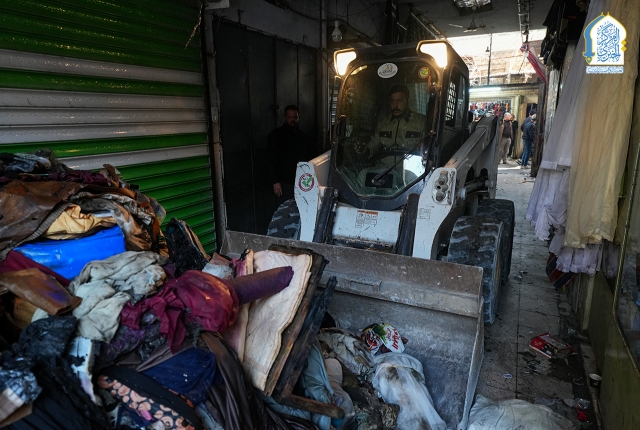 بتوجيه من الأمانة العامة للعتبة الكاظمية المقدسة، قام قسم الآليات من خلال وحدتي المركبات الصغيرة، والمعدات، بتنفيذ حملة خدمية لمساندة أصحاب المحال والمخازن المتضررة من حادث حريق منطقة باب الدروازة في مدينة الكاظمية المقدسة، حيث تم رفع الأنقاض ومخلفات الحريق الذي وقع فيها.