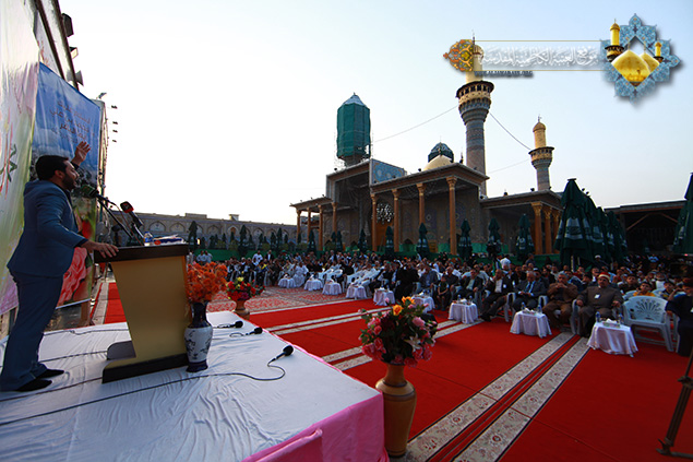 ينبغي أن نستثمر هاتين الولادتين الميمونتين في زيادة الحث على الاقتداء بنهج الأئمة المعصومين "عليهم السلام" وخطهم الرسالي والالتزام بالإيمان الحقيقي وأن يكون الجهاد في ساحات المعارك خالصاً في سبيل الله ودفاعاً عن الوطن العزيز والالتزام بتوجيهات المرجعية الرشيدة, كما ندعو الى المزيد من الجهاد في سبيل الله وبذل الغالي والنفيس تلبية لفتوى المرجعية الرشيدة , وأن ترعى عوائل الشهداء فهم أمانة في أعناقنا سائلين المولى القدير أن ينصر قوات الحشد الشعبي وقواتنا المسلحة وأن يتغمد شهداءنا بالرحمة ويسكنهم فسيح الجنات ويعجل بشفاء الجرحى.. " بعدها ارتقى المنصة الخطيب الحسيني سماحة الشيخ منير الكاظمي ليلقي في محاضرته القيّمة الضوء على شذرات من حياة الإمام الباقر ومسيرته الحافلة المعطاء متحدثاً عن هذه الشخصية التي توافرت كل المقومات والمؤهلات للزعامة والإمامة والقيادة والريادة حتى اضحى محط ثناء العلماء والفقهاء والفضلاء، مستشهداً بفضائله بلسان الدهر والعلماء الذين ملأت أسماؤهم ونتاجاتهم الآفاق. كما تناول جزءاً من حياة الإمام الهادي الذي تصدى للإمامة وهو في سن مبكر، ودوره الفاعل والذي تجسد بمدرسته الشريفة التي تخرج منها عدد كبير من العلماء والفقهاء، فضلاً عن دوره في المجادلات والمناظرات ومواجهته للمدارس الكلامية المنحرفة، والدفاع عن حقوق أهل بيت النبوة "عليهم السلام"، وتطرق إلى الإرث الفكري والحضاري الزاخر الذي تركه "عليه السلام" لأمة جده رسول الله "صلى الله عليه وآله" والتي لها أثر بالغ في نفوس المسلمين لما تحمله من قيمٍ ومعانٍ سامية. وشهد الحفل مشاركة لشاعر أهل البيت السيد نبيل أبو العيس بمجموعة قصائد رائعة ومنها هذه الأبيات: بحق الإمام الباقر "عليه السلام":