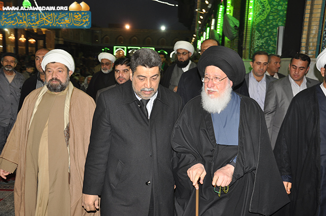 حيث كان في استقباله الأمين العام للعتبة الكاظمية المقدسة الحاج فاضل الأنباري وأعضاء مجلس الإدارة وخدمة الإمامين الجوادين(ع), وبعد أداء سماحته مراسيم الزيارة والدعاء عند ضريحي الامامين موسى بن جعفر وحفيده محمد بن علي الجواد(ع), أمَّ جموع المصلين لأداء فريضة صلاتي المغرب والعشاء في رحاب الصحن الكاظمي الشريف ,