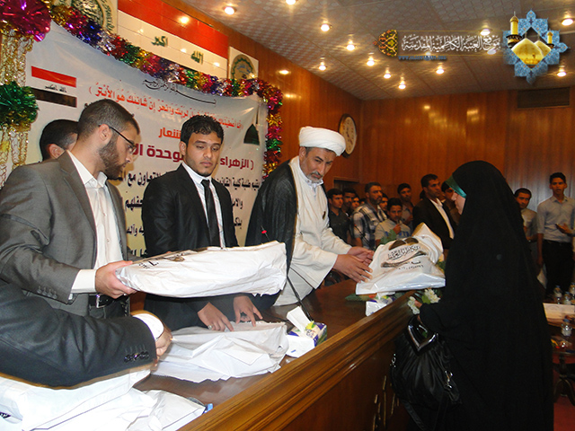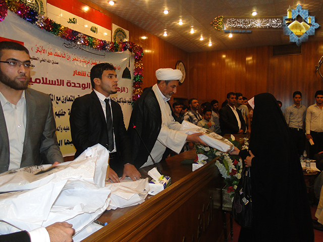 في خطوة تعكس مدى الاهتمام الذي توليه الأمانة العامة للعتبة الكاظمية المقدسة من أجل الانفتاح والتواصل مع المؤسسات العلمية والتربوية والفكرية والثقافية ومد جسور التعاون في نشر فكر وعقيدة آل البيت(ع) وترسيخ النهج المحمدي الأصيل, شاركت الامانة العامة للعتبة الكاظمية المقدسة وبتوجيه من امينها العام الحاج (فاضل الانباري) في الحفل السنوي الأول للذكرى العطرة لولادة بضعة النبي الأكرم (ص) فاطمة الزهراء(ع), الذي اقيم على قاعة كلية القانون تحت شعار(الزهراء عنوان الوحدة الاسلامية), برعاية طلبة كلية القانون في الجامعة المستنصرية وبالتعاون مع المكتب الطلابي العراقي, وكان للعتبة الكاظمية المقدسة حضور فاعل ومتميز في هذا الحفل المبارك الذي حضرته العديد من الشخصيات العلمية والاكاديمية والثقافية, حيث قدم فضيلة الشيخ (نجم الدراجي) الباحث في قسم الشؤون الفكرية والثقافية في العتبة المقدسة خلال المنهاج الذي اعد للحفل محاضرة دينية توجيهية تحدث فيها عن السيرة العطرة للصديقة الطاهرة فاطمة الزهراء(ع), وقدم شرحاً مفصلاً عن سورة الكوثر المباركة, كما وزعت العتبة الكاظمية المقدسة الهدايا للطالبات الملتزمات بالحجاب الاسلامي الشرعي .