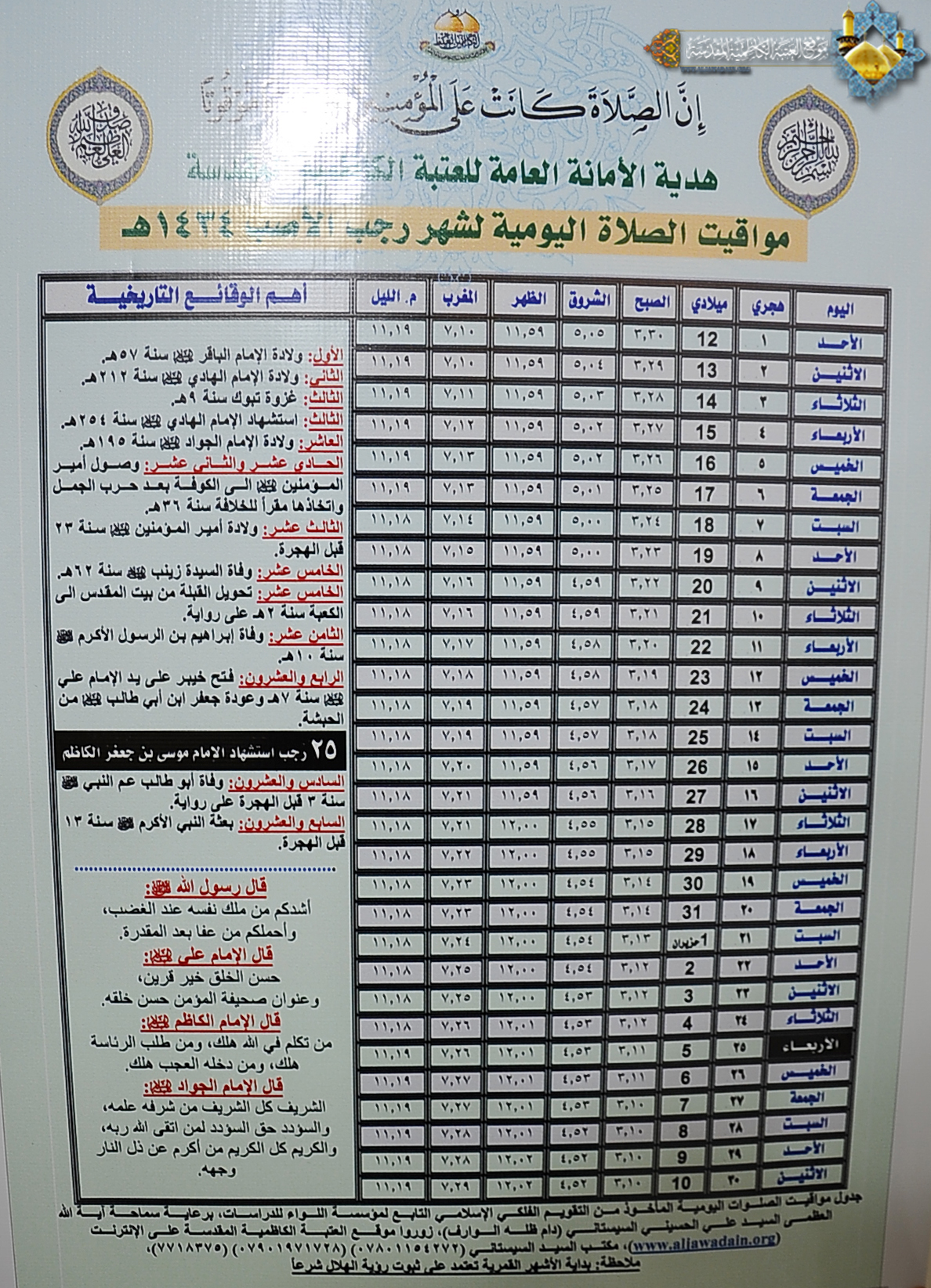بتوجيه من الأمانة العامة للعتبة الكاظمية المقدسة المتمثلة بأمينها الحاج(فاضل الانباري), اطلق قسم الشؤون الفكرية الثقافية مبادرة توزيع بوسترات المواقيت الشرعية وأهم المناسبات الدينية لشهر رجب الأصب على المساجد والجوامع والحسينيات في مدينة الكاظمية المقدسة والمناطق المحيطة بها, والتي ستستمر على مدار اشهر السنة الهجرية, ولاقت هذه التجربة استحسان متولي الجوامع والحسينيات وترحيب وقبول الكثير من المؤمنين لرفع الآذان بأوقاته الشرعية والتعريف بأهم الأحداث والمناسبات.