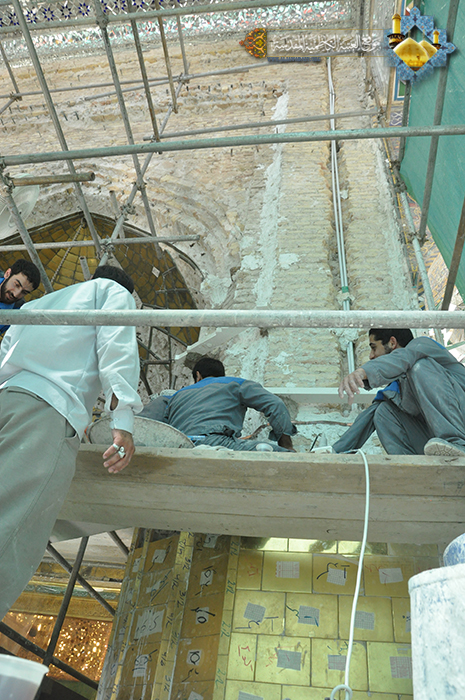 إعادة إكساء الواجهة الخارجية لطارمة باب المراد بالبلاطات الذهبية مشروع جديد يضاف إلى سجل المشاريع العمرانية التي تشهدها العتبة الكاظمية المقدسة, بعد ما تعرضت البلاطات الذهبية القديمة لتقادم الزمن وعهود الإهمال مما كانت سبباً لتلف العديد منها واسودادها وتساقطها, لذا عزمت الأمانة العامة للعتبة الكاظمية المقدسة من خلال ملاكاتها الهندسية على انجاز هذا المشروع الذي سيضفي لمسات جمالية جديدة وبنقوش إسلامية متناسقة وحديثة تتلائم مع رونق وبهاء هذا الصرح الإسلامي الكبير. وعن مراحل هذا المشروع حدثتنا رئيس اللجنة المشرفة المهندسة (نادية فؤاد الأعسم) قائلةً: حقق مشروع أعمال تركيب البلاطات الذهبية الجديدة نسبة بلغت40% من الإنجاز, بعد مروره بمراحل عدة ابتداءً من إعداد التصاميم ورفع البلاطات القديمة من الطارمة, والقيام بأعمال الصيانة الأولية والمعالجة الإنشائية وأعمال التأسيسات الكهربائية الجديدة التي تسبق تنصيب البلاطات وواصلت حديثها حول تصنيع البلاطات قائلةً: تم تصنيع البلاطات الذهبية من مادة النحاس وطلائها بالذهب عيار (24) بقياسات وأشكال مختلفة حسب التصاميم الهندسية المصادق عليها, علماً ان البلاطات المصنعة تخضع لفحوصات جهاز التقييس والسيطرة النوعية. وتابعت حديثها عن مراحل تقطيع البلاطة وعملية تنظيفها وتنعيمها ودرجة اللمعان المطلوبة وصولاً إلى طريقة الطلاء الإلكتروني الحديث المتبع الآن في العالم أجمع تنجز في معمل طلاء الذهب في العتبة الكاظمية المقدسة, وذكرت إنه سيتم انجاز هذا المشروع المبارك خلال أربعة أشهر إن شاء الله تعالى.