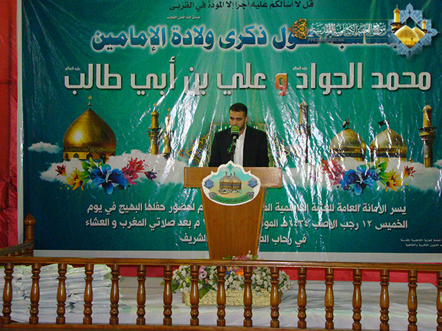 فإن الإمام الجواد(ع) يبقى قدوة لشبابنا الواعد ليعرفوا كيف يبنون مجتمعاً رصيناً محصناً بفكر خالٍ من كل ما يشوه ديننا وعقيدتنا وأن يكونوا درعاً حصيناً ضد كل الثقافات المنحرفة, وليعرفوا كيف يكسبوا أفراد المجتمع من خلال المعاملة القائمة على مكارم الأخلاق وصدق الحديث والدفاع عن الدين المحمدي الأصيل). ثم ألقى عدد من الشعراء القصائد الولائية من الشعر القريض والشعبي والتي نهلت من بحر علمه وفيض كرمه واخلاقه العظيمة وسجاياه النبيلة من بينهم الشاعر (محسن الموسوي وعلي اللامي).