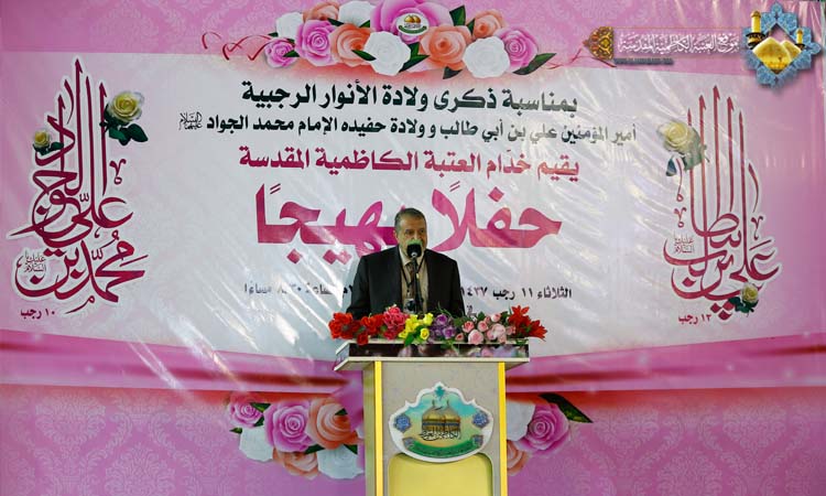 بزغ فجر جديد بولادتين أصبحت نبراساً للتاريخ الإنساني وعنواناً لكل القيم والمعاني، حملت عبء المسؤولية ورسمت بخطواتها الأبعاد الحقيقية للنهج الرسالي, وتيمناً بهذه المناسبتين الكريمتين أقامت الأمانة العامة للعتبة الكاظمية المقدسة الثلاثاء 19 نيسان 2016م حفلاً بهيجاً في رحاب الصحن الكاظمي الشريف بذكرى ولادة أمير المؤمنين علي بن أبي طالب وحفيده تاسع الأئمة الأطهار باب المراد الإمام محمد الجواد "عليهما السلام"، بحضور معالي رئيس ديوان الوقف الشيعي سماحة السيد علاء الموسوي والأمين العام للعتبة الكاظمية المقدسة أ. د. جمال عبد الرسول الدباغ وعدد من الشخصيات الاجتماعية وجمع غفير من زائري الإمامين الجوادين "عليهما السلام" التي جاءت لتتشرَّف بإحياء هذه المناسبة المباركة.