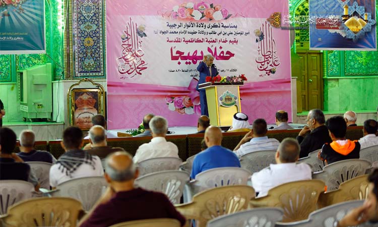 تأسى لكيد الخائنين وتألمُ ... مولاي تعلم أنهم ما أسلموا وكانت هناك مشاركة أخرى لخادم الإمامين الجوادين الشاعر الحسيني السيد نبيل أبو العيس بقصيدة مطلعها: عَجَزَ المديح ونادى في فمي الكَلِمُ ... ماذا اقول بمن تَحيا به الرِمَمُ وارتقى المنصة سماحة الشيخ منير الكاظمي ليلقي محاضرته الدينية بهذه المناسبة، تحدث فيها عن عظمة شهر رجب الأصب وأيامه وفضائله وقدر لياليه، كما استعرض فيها شمائل أمير المؤمنين الشريفة وسر شخصيته، ومنهج عدالته، وشهادات من ارتبط به وبفكره الإنساني، وأشار إلى الإمام الجواد "عليه السلام" ومعجزاته للناس ودوره الريادي في قيادة الأمة، وصولاته وجولاته العلمية. وكان لفرقة إنشاد الجوادين أداء متميز بهذه المناسبة المباركة بمجموعة من الموشحات الدينية، كما تألق الرادود الحسيني مصطفى الكناني بقصائده الجميلة ليرسم الفرحة والبهجة والسرور في نفوس الحاضرين.
