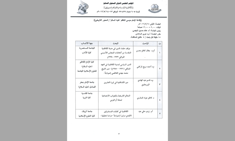 وضعت اللجنة التحضيرية للمؤتمر العلمي الدولي السابع الذي سيعقد للمدة من 5ـ6 شعبان الموافق 13ـ14 آيار 2016م تحت شعار: مدينة الكاظمية (عراقة وتحديات ورؤى ) اللمسات الأخيرة والاستعدادت النهائية لاستكمال تحضيرات انعقاده، إذ تعلن اليوم عن البرنامج التعريفي الخاص بالفعاليات وأسماء الباحثين المشاركين في المؤتمر في الجدول المبين أدناه.