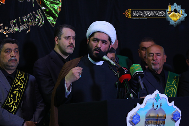 تلته كلمة السيد الأمين العام التي ابتدأها بعبارات التعزية والمواساة للإمام موسى بن جعفر الكاظم ع وللإمام المنتظر عجل الله فرجه الشريف ولمراجع الدين العظام بهذا المصاب الجلل, مشيراً الى عظم هذه الذكرى الاليمة وبدء أيام العزاء والحزن في هذه البقعة الطاهرة والتي نستذكر من خلالها كل القيم الانسانية الرسالية التي ضحى من اجلها الامام الكاظم, كما أكد على ضرورة الالتزام بنهج ووصايا أهل البيت(ع) واحياء ذكرهم العطر من خلال افشاء لغة السلام والتسامح والمحبة لنحيا حياة طيبة ملؤها الاحترام والمساواة, واشار الى ضرورة ان يكون خادم الامامين الجوادين بمستوى هذه المكانة التي يحظى بها وهي مسؤولية شرف الخدمة وهو شعار كل مؤمن, ثم تطرق الى مناقب الإمام السابع من أئمة الهدى عليهم السلام وما لاقاه من جور وظلم سلطة بني العباس الحاكمة التي حاربت الخط الرسالي والمدرسة الإلهية لأهل بيت الرحمة (ع), واشار الى ما أعدته العتبة الكاظمية لإحياء مراسم هذه الفاجعة الأليمة بعدها جرت مراسم استبدال الرايات في أجواء خيم عليها الحزن والأسى حيث َتجدُد احزان أهل البيت(ع) مع قرب حلول الخامسة والعشرين من شهر رجب الأصب. بعدها القى سماحة الشيخ (مكي آل شطيط الطائي) محاضرة جاء فيها: اليوم يرفع الموالون في العراق والعالم الاسلامي شعار الحداد والمواساة في ذكرى استشهاد امام عظيم فرض الله طاعته ومودته ومحبته, وحري بنا ان نتمسك بنهجه فهو من اهل بيت عرفوا بعصمتهم ومكانتهم الرفيعة عند الله والحق معهم وفيهم وبهم, فامامنا الكاظم(ع), يعلمنا كيف نقيم الصلاة ونأمر بالمعروف وننهى عن المنكر, وكيف نميز بين الحق والباطل وهو الرحمة المهداة بعد جده النبي الأكرم(ص) وآبائه الاطهار(ع), تلى ذلك القاء قصيدة لشاعر أهل البيت سماحة الشيخ (احمد الدر العاملي) خلدت صاحب الذكرى الاليمة والتي رسم فيها صورة رائعة عبرت عن مدى الحزن والألم الذي أصاب نفوس موالي أهل البيت بفقدان الإمام موسى بن جعفر الكاظم(ع) الذي كان نبراسا يستضاء به في ميادين العلم والمعرفة واستمرت فقرات مراسم العزاء بالمراثي الحسينية التي شارك فيها الرادود حيدر الصغير وكرار الكاظمي .
