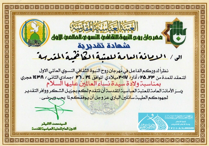 تقدمت الأمانة العامة للعتبة العباسية المقدسة بالشكر والتقدير إلى الأمانة العامة للعتبة الكاظمية المقدسة وإذاعة الجوادين، وذلك لمشاركتها الفاعلة في مهرجان روح النبوة الثقافي النسوي العالمي الأول، الذي أقيم بمناسبة ولادة السيدة الزهراء "عليها السلام"، حيث تؤكد هذه المبادرات المباركة تعزيز العلاقات والتواصل بين العتبات المقدسة والمزارات الشريفة لتحقيق أهدافها وبرامجها التنموية على الصعيد الرسالي والفكري والإنساني لخدمة أهل بيت النبوة "عليهم السلام" وزائريهم الكرام.