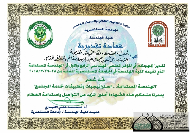 تقدّم عميد كلية الهندسة في الجامعة المستنصرية الأستاذ الدكتور محمد علي الأنباري بالشكر والتقدير إلى الأمين العام للعتبة الكاظمية المقدسة الأستاذ الدكتور جمال عبد الرسول الدباغ، وذلك تقديراً لجهوده المباركة في دعم المشاريع العلمية ومنها المؤتمر العلمي الرابع والأول في الهندسة المستدامة الذي أقيم تحت شعار: ( الهندسة المستدامة .. استراتيجيات وتطبيقات لخدمة المجتمع ).