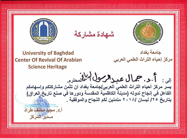 تقدّم مدير مركز إحياء التراث العلمي العربي في جامعة بغداد الأستاذ الدكتور مجيد مخلف طراد بالشكر والتقدير إلى الأمين العام للعتبة الكاظمية المقدسة الأستاذ الدكتور جمال عبد الرسول الدباغ، وذلك لدوره في المشاركة والمساهمة في الندوة العلمية التي أقامها المركز بعنوان: (مدينة الكاظمية المقدسة ودورها في صنع تاريخ العراق).