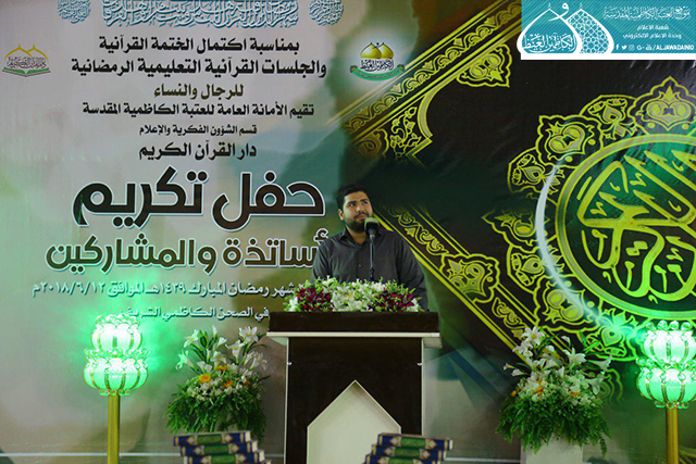 استهل الحفل بتلاوة مباركة من الذكر الحكيم شنّف بها أسماع الحاضرين الطالب مصطفى حميد، أعقبها كلمة الأمانة العامة للعتبة الكاظمية المقدسة، ألقاها فضيلة الشيخ عدي الكاظمي قائلاً: في رحاب القرآن والعترة الطاهرة "عليهم السلام" اجتمعنا في هذا المكان الشريف، لنقطف هذه الثمار المباركة التي واصلت حضورها هذه المجالس لقراءة القرآن الكريم وتعلمه والتدبر فيه، وأدعو من خلال هذا الحفل الكريم الآباء والأمهات حثّ أبناءهم في مواصلة المسيرة القرآنية لأنها الدعامة الأساسية في بناء شخصية الإنسان، وكذلك ينبغي الاهتمام بلغة القرآن الكريم والنبي الأكرم "صلى الله عليه وآله وسلم" ألا وهي " اللغة العربية " التي نشهد هجرها في هذه الأزمنة والابتعاد عنها، والدخول في لغة غريبة مرقعة لا أصل لها ولا أساس، وضرورة الاهتمام بروح القرآن والتخلق بأخلاقه.