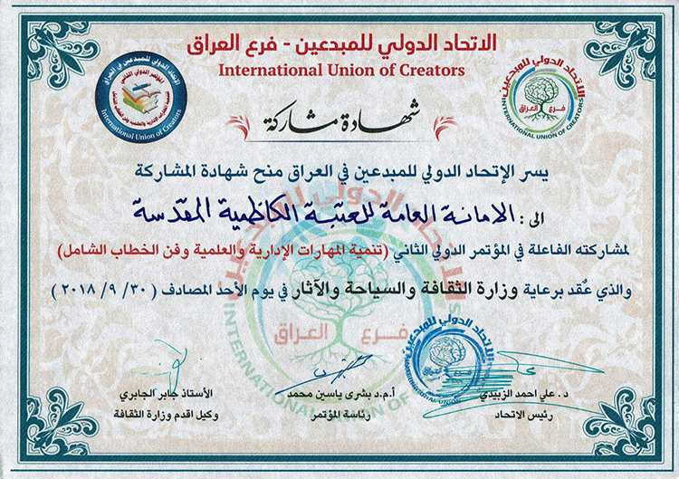 الأمانة العامة للعتبة الكاظمية المقدسة تحصل على شهادة مشاركة من الاتحاد الدولي للمبدعين