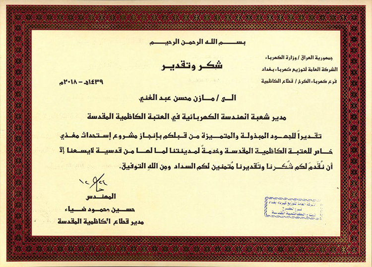 توجّهت الشركة العامة لتوزيع كهرباء بغداد/ فرع كهرباء الكرخ/ قطاع الكاظمية بشكرها وتقديرها إلى عدد من الخدم في العتبة المقدسة، وذلك تثميناً لجهودهم المباركة، ودورهم المتميز في إنجاز مشروع إستحداث المغذي الكهربائي الخاص بالعتبة المقدسة، وخدمة المدينة المقدسة.
