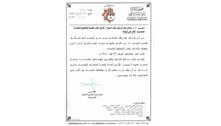 تقدّم الأمين العام للعتبة العباسية المقدسة المهندس محمد عبد الحسين الأشيقر، بالشكر والتقدير إلى الأمين العام للعتبة الكاظمية المقدسة الأستاذ الدكتور جمال عبد الرسول الدباغ، وذلك إشارةً إلى التهنئة المقدّمة لمناسبة تجديد تعيينه لمنصب الأمين العام للعتبة العباسية المقدسة.