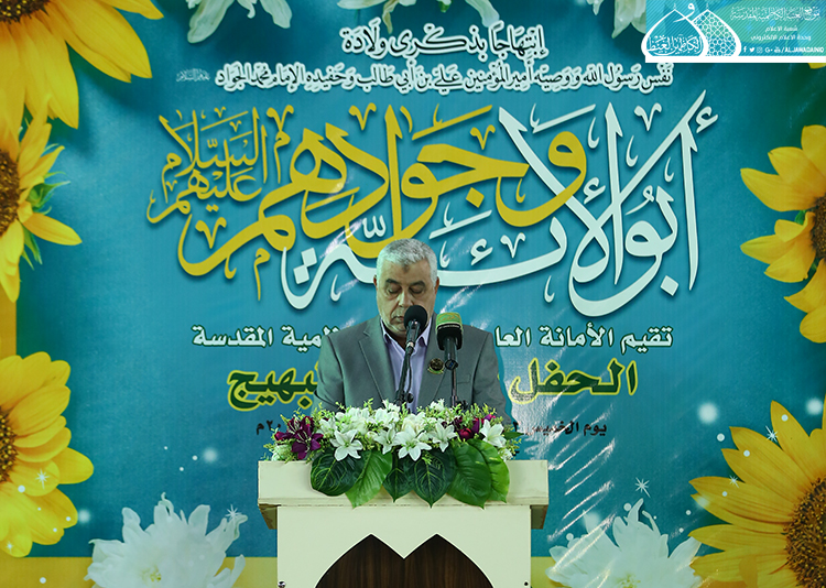 استٌهل الحفل بتلاوة آيات من الذكر الحكيم شنّف بها القارئ السيد عبد الكريم قاسم أسماع الحاضرين، تلتها كلمة الأمانة العامة للعتبة الكاظمية المقدسة ألقاها أمينها العام قائلاً: ( مع تقادمِ الأزمانِ، تعاودُنا في شهرٍ تعلوهُ غرةٌ غرّاءُ وهو شهرُ رجبٍ الأصبِّ، وقائعُ باسقاتٌ، حيث ولادةُ إمامِ المتقينَ وحفيدِهِ جوادِ العترةِ الهاديةِ "عليهما السلام". فمن المناسبِ جداً أن لا ينحصرَ الاحتفالُ بهاتينِ المناسبتينِ البهيَّتينِ في زاويةِ الثناءِ والإطراءِ الذي لا يؤدّي أي خدمةٍ لمنطقِ الوعي الإسلامي، أو أن ننظرَ إلى الولادتينِ الميمونتينِ على أنَّهما مجردُ استرجاعٍ لذكرى طيّبةٍ من دونِ أن نُدركَ مغزاهما الإنساني. فولاداتُ الأئمةِ الأطهارِ "عليهم السلام" هي نقاطٌ مضيئةٌ في حياتِنا يجبُ أن لا نمرَّ بها مروراً سطحياً، لذلك باتَ من اللبِّ أن نجعلَ من هذهِ المناسباتِ الروحيةِ محطّاتٍ للتزود بالزاد، وباعثاً ذاتياً يُحرّكُ فينا الصمودَ والجهادَ، ويقلبُ بوارَ نفوسِنا جناناً، وذلك يكون بعد أن نَعِيَ قيمتَها ونُحسنَ استثمارَها ونستلهمَ من هديِها. فالعِبرةُ التي يجبُ أن نخرجَ بها من هذا الإحياءِ والاحتفاءِ في حاضرِنا الراهنِ ونحنُ نعيشُ هذهِ الأوضاعَ المضطربةَ، حيث تشتدُّ حملةُ الإرهابِ المسعورةُ على الطليعةِ المؤمنةِ والبقيةِ الصامدةِ، هو أن نتابعَ خطواتِ أصحابِ هذه الذكرى في الدفاعِ عن بيضةِ الإسلامِ، وأن نجعلَ من جهادِهم رائدَنا في كفاحِنا ونضالِنا اليوم ضد أعدائهم.