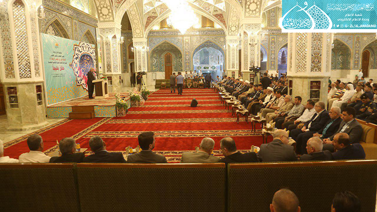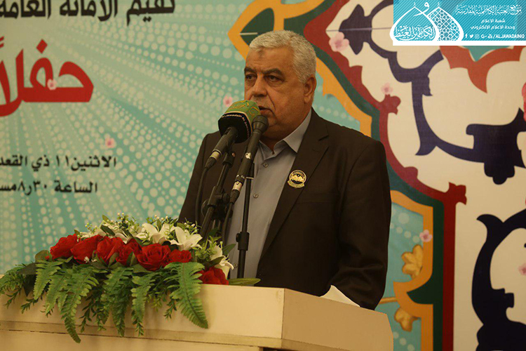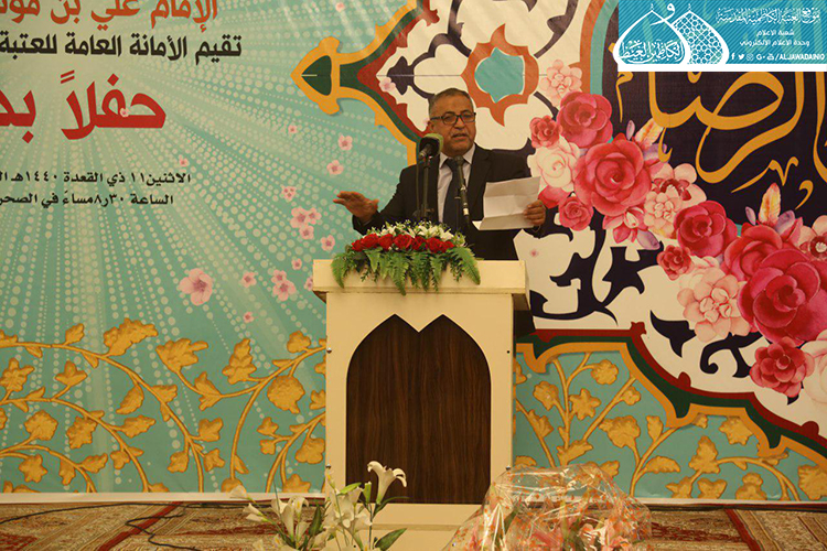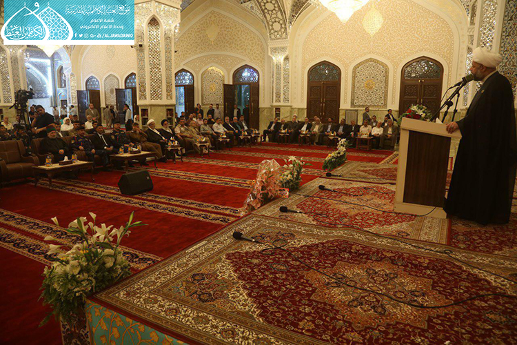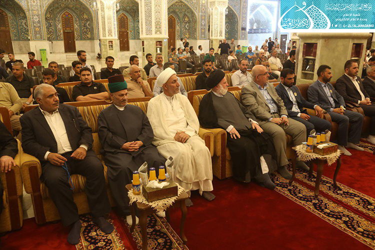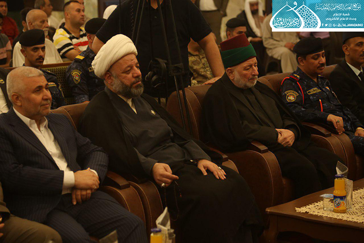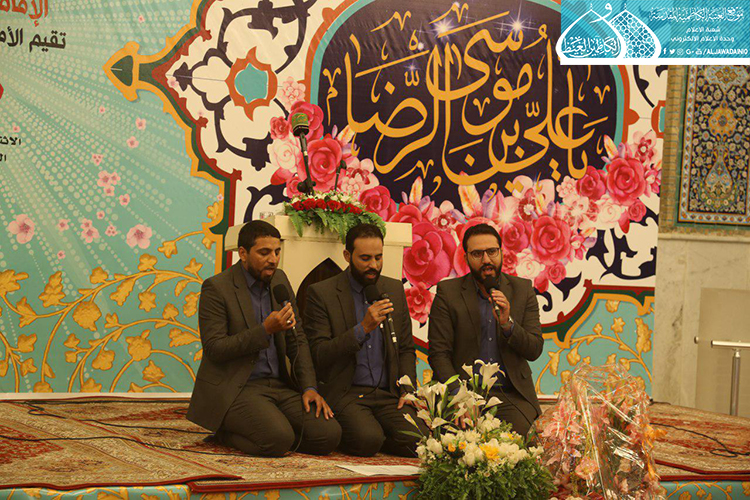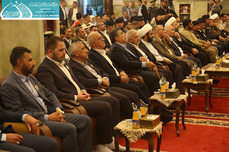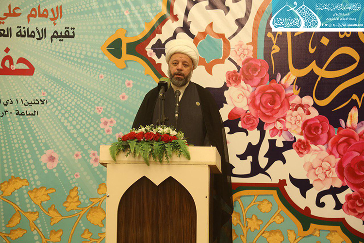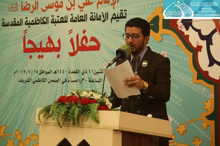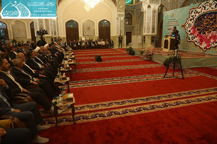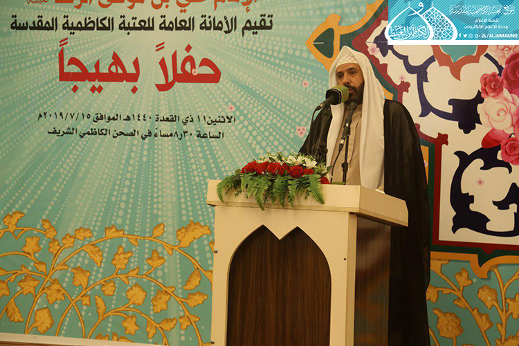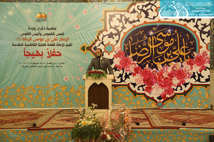 استهل الحفل بتلاوة آيٍ من الذكر الحكيم شنّف بها أسماع الحاضرين السيد عبد الكريم قاسم، تلاها كلمة العتبة الكاظمية المقدسة بهذه المناسبة العطرة وألقاها عن أمينها العام فضيلة الشيخ عَدي الكاظمي قائلاً: ( ونَحن نَشَهد هذه الأيام المباركة، وخاصة مولد إمامنا الرضا "عليه السلام"، الإمام الرحيم الرؤوف، الذي تُستسقى من حياتهِ الشريفة الدروس وتأخذ العبر على مرّ التاريخ، ولعل من أهم تلك الدروس التي نستطيع أن نفهمها، وأن تكون درساً مهماً في حياة المؤمن هما أمران، الأول: مسألة الإمامة والمأموم، وهي أصل ثابت بحقّ مواليّ أهل البيت "عليهم السلام"، إذ أن هناك مرحلة جديدة في حياة الإمام الرضا "عليه السلام" من خلال استقدامه من المدينة المنورة نحو طوس، وتعيينه بفرض وتهديد قَسري من قبل المأمون العباسي بأن يكون ولياً للعهد، فهنا محل الدَرس ألا وهو ما ثبت ان هناك إماماً ليس منفصلاً عن المدّ السماوي الإلهي، فدور المأمومين هنا لا بد من الطاعة والانصياع، لا المناقشة والاعتراض، إذ أراد الإمام "عليه السلام" من هذا الأمر وأسس إليه تعليم الأمة درساً جديداً، وهو بما أنكم تؤمنون بإمام معصوم فلا نقاش في ذلك ولا أمر لكم إلا أن تنصاعوا فيما أسلكه في هذا الطريق. فدرس معرفة القائد والمقود، والزعيم والتابع ينبغي أن يكون حاضراً بيننا، من خلال تمسكنا بالمرجع وهو نائب الإمام، والالتزام بقرار التسليم والانقياد والابتعاد عن الخصوم والاعتراض، ليتسنى له بناء قاعدة متينة رصينة، وهذا ما شهدناه واثبته أخواننا وأبنائنا جزاهم الله خير الجزاء حين ضحوا بأرواحهم ودمائهم، وبالغالي والنفيس لأجل الدفاع عن عراق المقدسات.