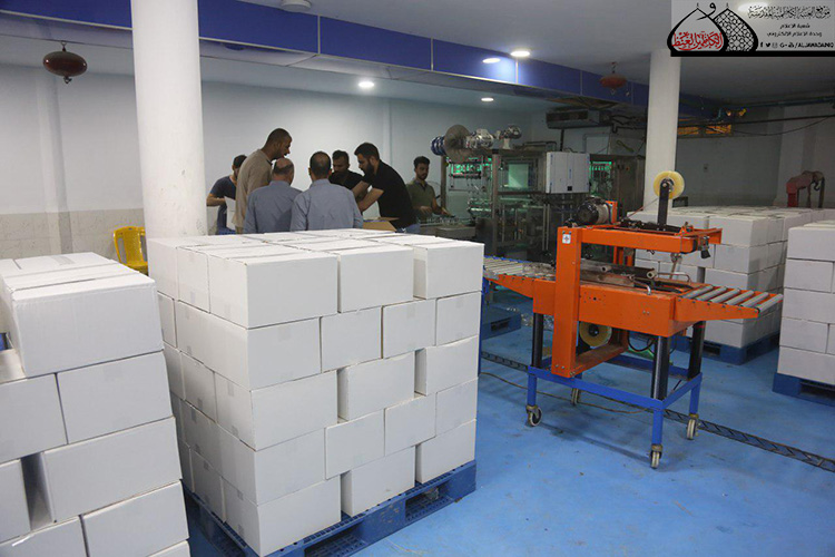 وبيّن في حديثه أن الطاقة الانتاجية في الوقت الحالي قد تصل إلى أكثر من (300) صندوق ويضم الصندوق الواحد (60) قدحاً يومياً والعدد في تصاعد مع مراعاة الجودة، وأن هذه الكميات من المياه توزع على النحو الآتي: منها لسدّ حاجة مضيف الإمامين الجوادين "عليهما السلام"، وأخرى ستوزع إلى أماكن مبيت الزائرين الكرام التابعة للعتبة المقدسة، وجزء منها سيوزع على المواكب الحسينية والجوامع والحسينيات والبيوتات المُضيّفة في مدينة الكاظمية المقدسة والمناطق المجاورة لها. كما أشار إلى أن الأمانة العامة للعتبة الكاظمية المقدسة شرعت منذ وقت مبكر بتجهيز المعمل بالمواد الأولية من الكارتون، وعبوات الأقداح والأغلفة المصنوعة من مادة الألمنيوم.
