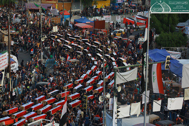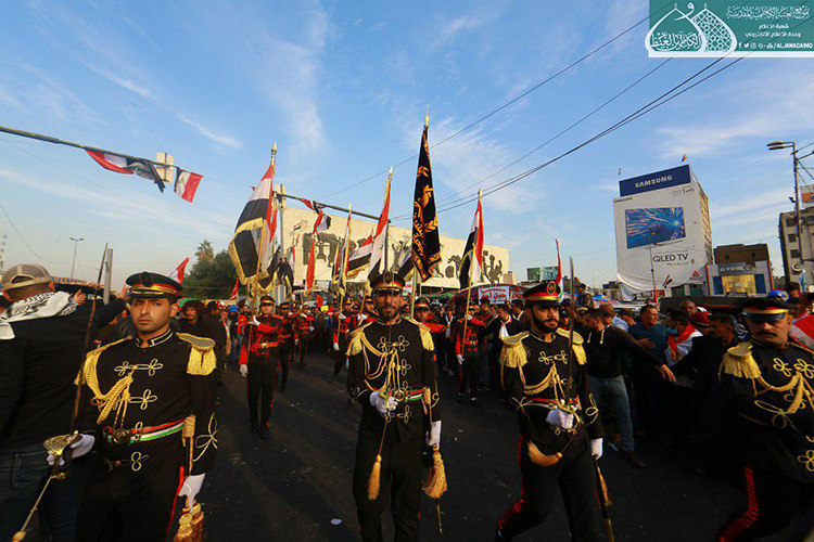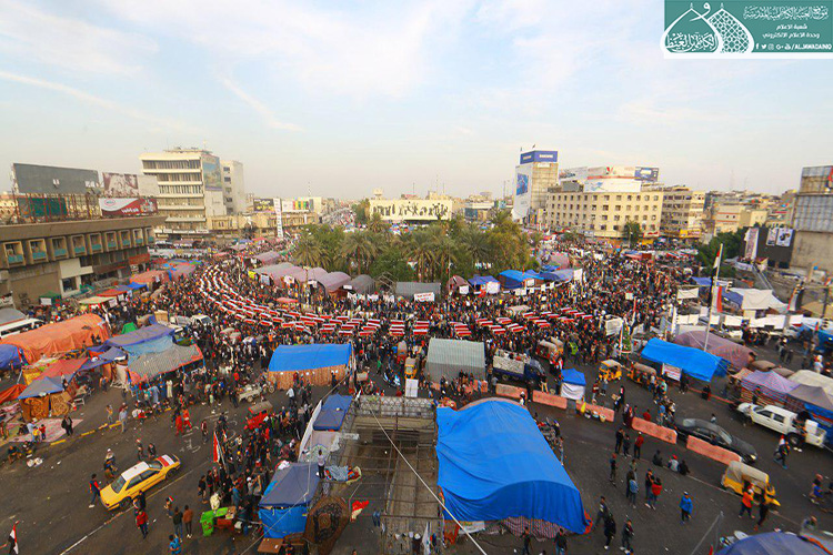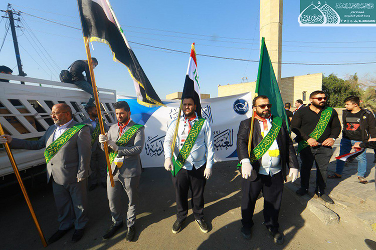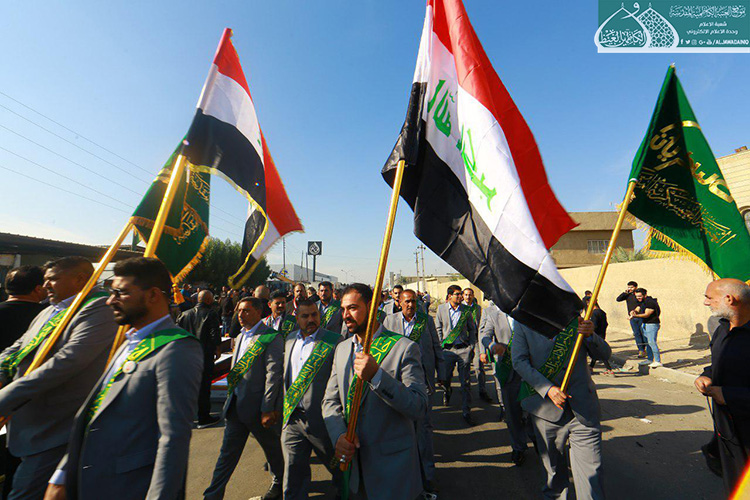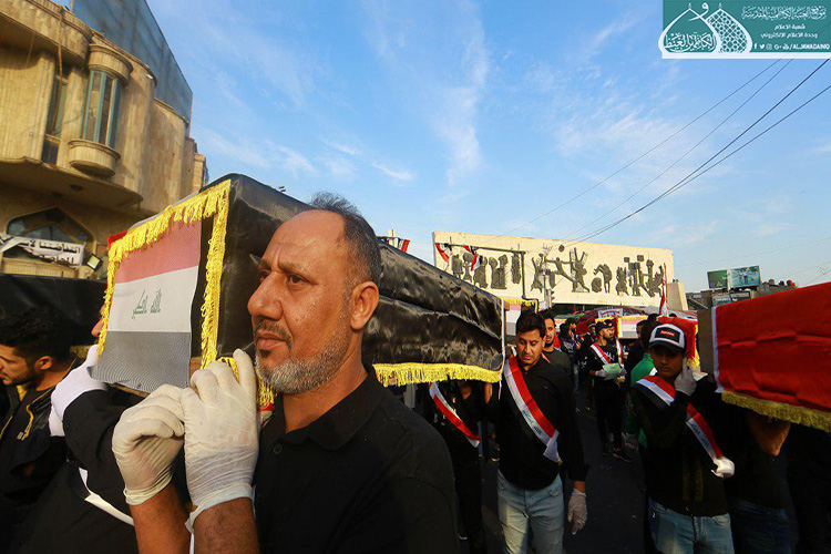 إكراماً للدماء الطاهرة التي نزفت في دروب التضحية والولاء والفداء ليرتقوا سُلّم المجد والشهادة والخلود من أجل العراق، الذين عقدوا العزم لبذل أرواحهم ومهجهم لإعلاء كلمة الحقّ والمطالبة بحقوقهم المشروعة التي كفلها الدستور، وبتوجيه من قبل الأمين العام للعتبة الكاظمية المقدسة الأستاذ الدكتور حيدر حسن الشمّري لدعم معركة الإصلاح الوطنية التي نادت بها المرجعية الدينية العُليا متمثلة بسماحة آية الله العظمى السيد علي الحسيني السيستاني "دام ظله الوارف"، شارك كوكبة من خدّام الإمامين الكاظمين الجوادين "عليهما السلام" مع إخوانهم في العتبة العسكرية المقدسة بالمسيرة التأبينية والتَشييع الرمزي لشهداء المظاهرات السلمية والاحتجاجات الشعبية التي شهدتها ساحة التحرير بالعاصمة بغداد حاملين رايات العراق، والراية المباركة للإمامين الكاظمين الجوادين "عليهما السلام"، حيث صَدحت حناجرهم بعبارات الحزن والمواساة، وانتهت تلك المسيرة بوقفةٌ احتجاجية طالبت بالتزام التوصيات والتوجيهات التي أكدت عليها المرجعية العُليا في النجف الأشرف في الحفاظ على سلمية التظاهرات، وتحقيق مطالب الشعب العراقي وطموحاتهم المشروعة وعدم تسويفها، وتحقيق الإصلاح في جميع مفاصل المنظومة الحكومية.