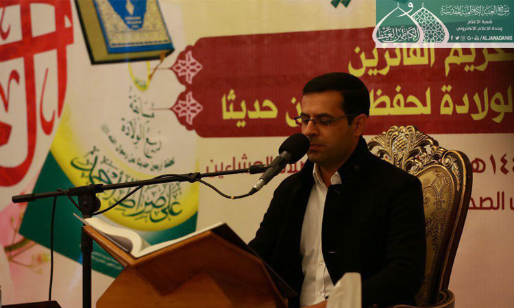 واحتراماً لمشاعر العوائل المفجوعة بأبنائها وترحماً على أروح الشهداء ارتأينا أن نقيم اليوم محفلاً قرآنياً بعيداً عن مظاهر الفرح والسرور فتغمد الله شهداءنا برحمته الواسعة وعافى جرحانا .. كما يُطيب لنا أن نوجّه كلمة طيبة لأبنائنا وبناتنا الفائزين بمسابقة ربيع الولادة لحفظ أربعين حديثاً للنبي الأعظم محمد "صلّى الله عليه وآله وسلّم" الذي قال: ( ياعلي مَن حفَظ من أُمتي أربَعين حديثاً يطلُبُ بذلك وَجه الله والدار الآخرة حشرهُ الله يوم القيامة مَعَ النَبيينَ والصديقينَ والشُهداءِ والصالحِينَ وَحَسُن أولئكَ رَفيقاً )، فهنيئاً لكم هذا الفوز وهذا التكريم وأذكّركم أن أهم من هذا الفوز هو تطبيق ما حفظتموه من تلك الأحاديث في حياتكم اليومية لتكون شعاركم وخارطة طريق لسلوككم وهذا هو الفوز الأهم ..)