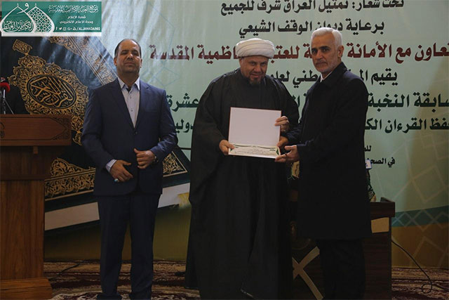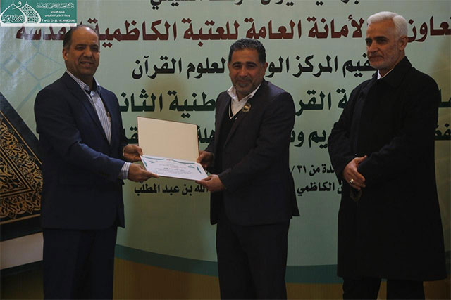 وفي ختام المسابقة قدّم مدير المركز الوطني لعلوم القرآن الكريم هدية تذكارية إلى الأمين العام للعتبة الكاظمية المقدسة، وتوزيع الدروع والشهادات التقديرية إلى أعضاء اللجنة التحكيمية واللجان التنظيمية والحفّاظ والقرّاء الفائزين الذين صدحت حناجرهم وجادت قرائحهم بتلاوات مباركة من الذكر المجيد والذين سيمثلون العراق في المحافل والمسابقات الدولية.