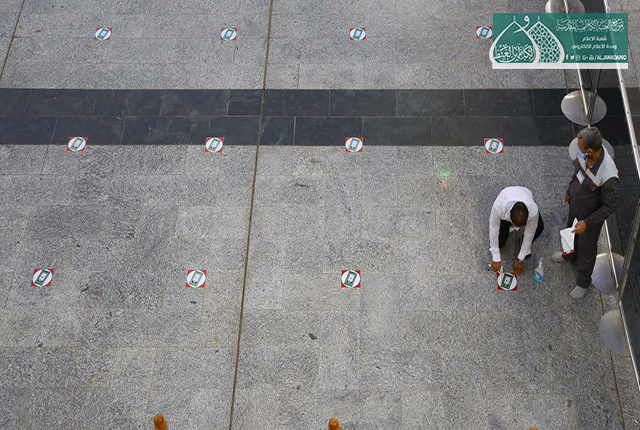 من أجل الحفاظ على صحة وسلامة الزائرين الكرام القاصدين حرم الإمامين الكاظمين الجوادين "عليهما السلام" ولدرء مخاطر الإصابة بوباء كورونا المستجد (COVID -19)، أطلقت العتبة الكاظمية المقدسة وبتوجيه من أمينها العام الأستاذ الدكتور حيدر حسن الشمّري مبادرة إنسانية جديدة وذلك بنشر مُلصقات تحدد أماكن الوقوف واتجاه القبلة لأداء الصلاة في رحاب الصحن الكاظمي الشريف لتحقيق التباعد الصحي الوقائي، والحفاظ على المسافات الصحية بين المصلين للحدّ من انتشار الإصابة بالفيروس، فضلاً عن تحديد اتجاه ومسار القبلة بدقة متناهية في العتبة المقدسة وفقاً للمعايير العلمية الدقيقة.